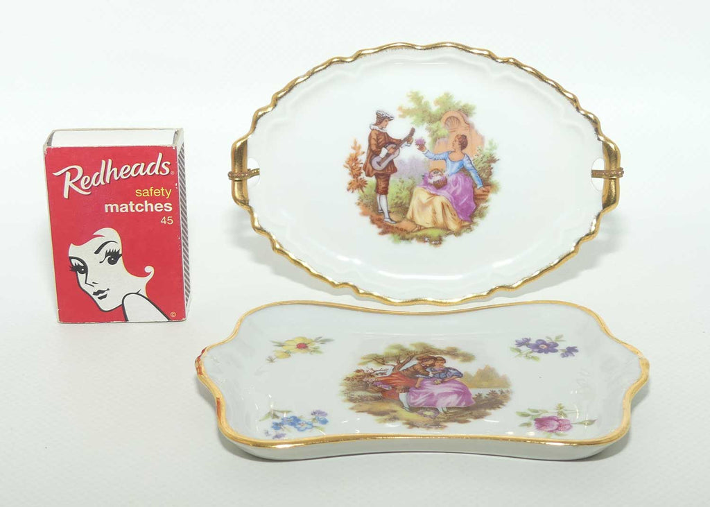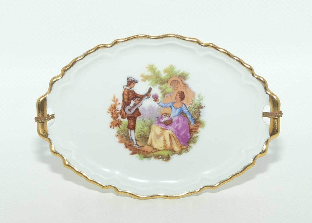 The oval tray is approx 11cms (4 1/3") wide and approx 7.5cms (3") tall