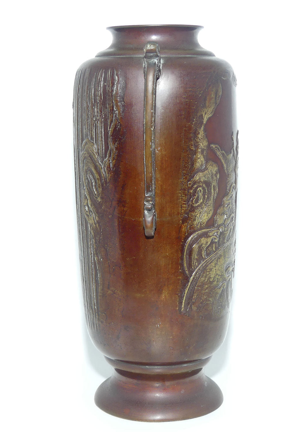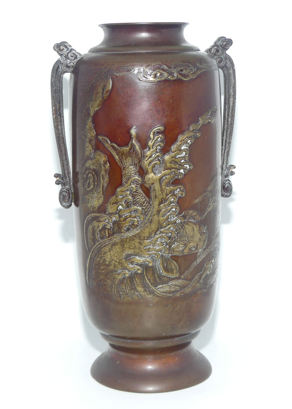 There are 2 different scenes on the vase - Koi within reeds and Koi swimming vertically within a depiction of water. Chinese tradition tells of carp (koi) attempting to swim upstream at the Dragon Gate rapids, impeded by demons who increased the height of the waterfall. After considerable struggle, the carp which succeeded were turned into golden dragons. The fish consequently became an emblem of perseverance and success, and of a destiny fulfilled. The scene on these vases evokes the legend, and may be related to a samurai’s coming-of-age ceremony (genpuku) when carp streamers called koinobori are flown on poles. In Japan, koi are particularly associated with the steadfastness and determination of the samurai.