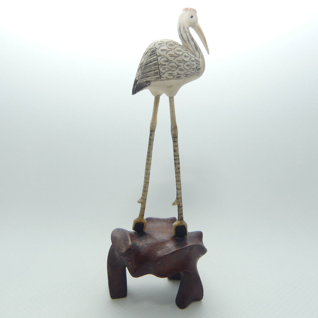 Mid 20th Century Chinese Ivory and Bone Carved Crane on Wooden Base