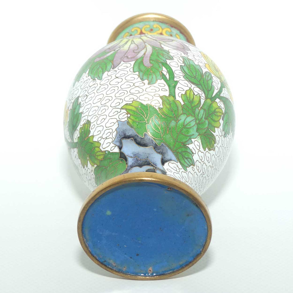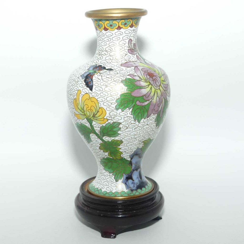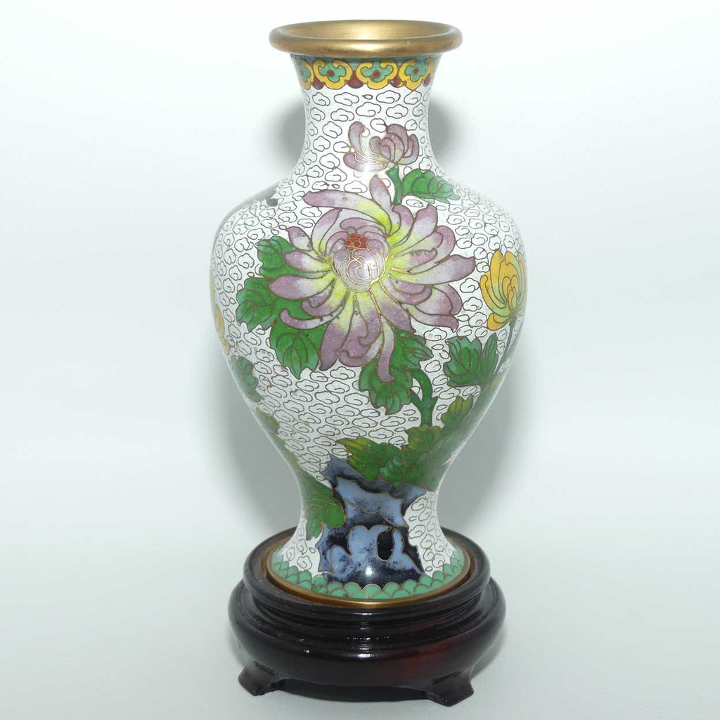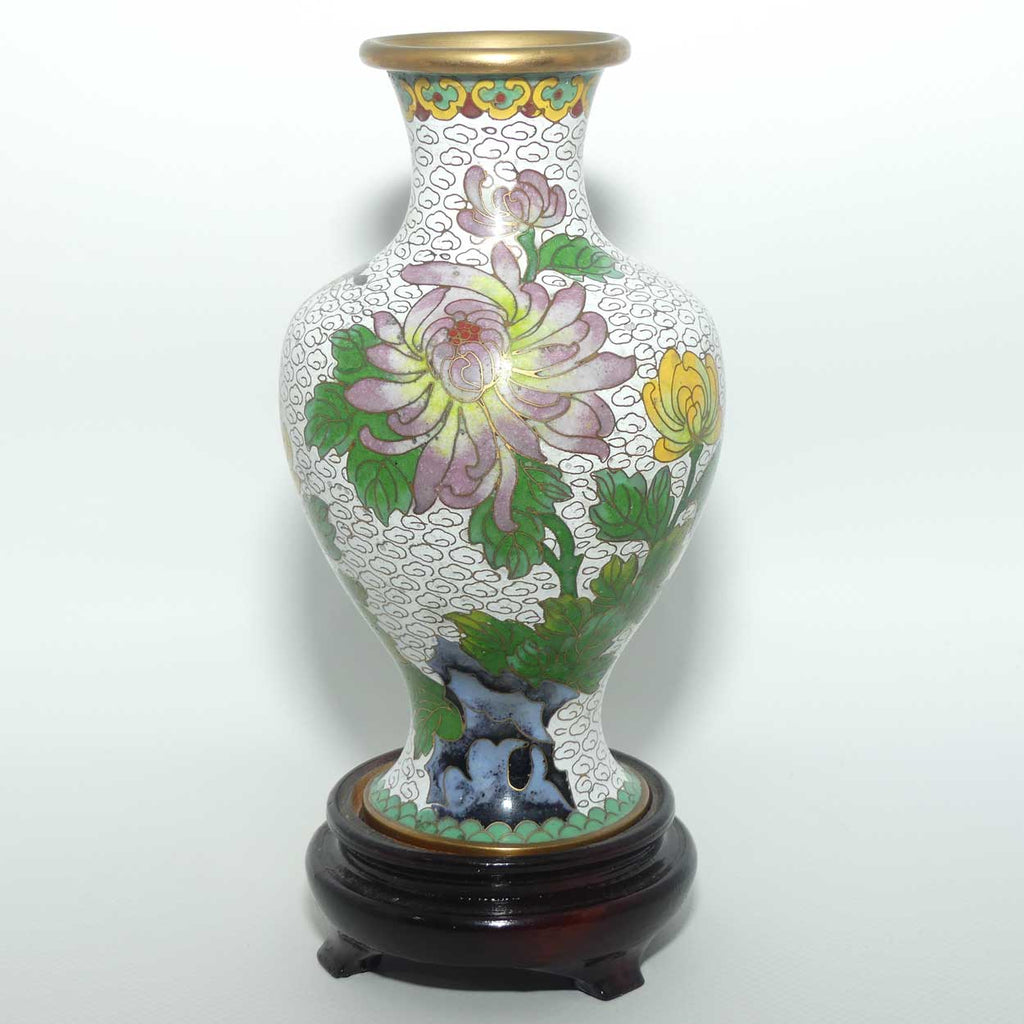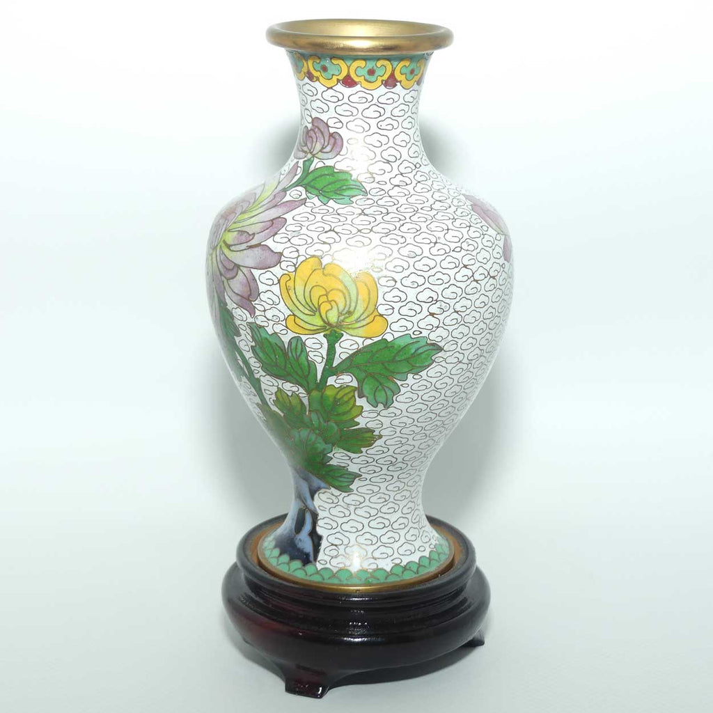 Mid Century Cloisonne vase on stand | White with Lotus Flower