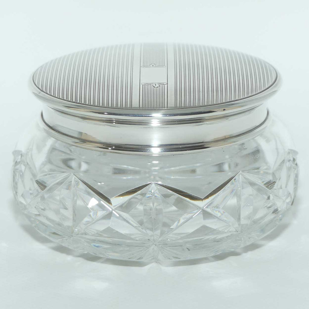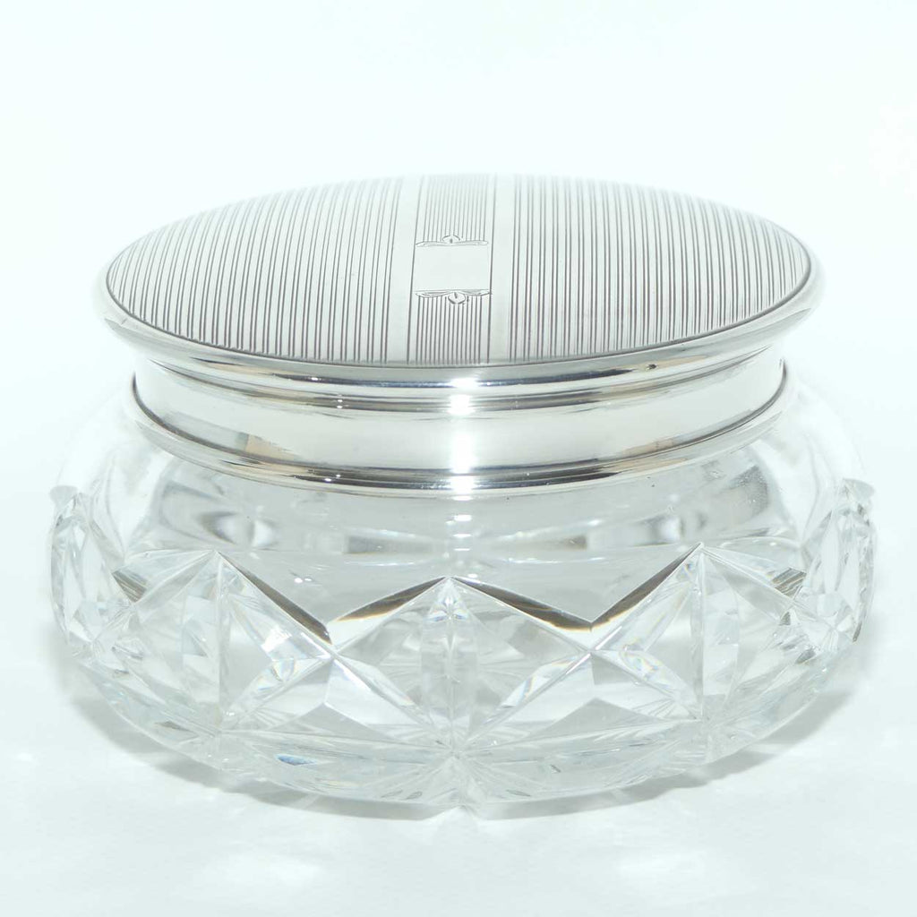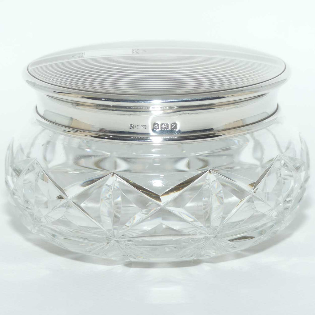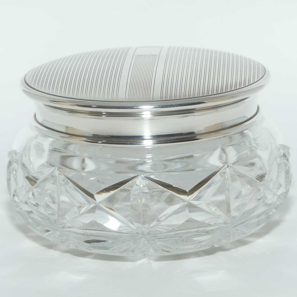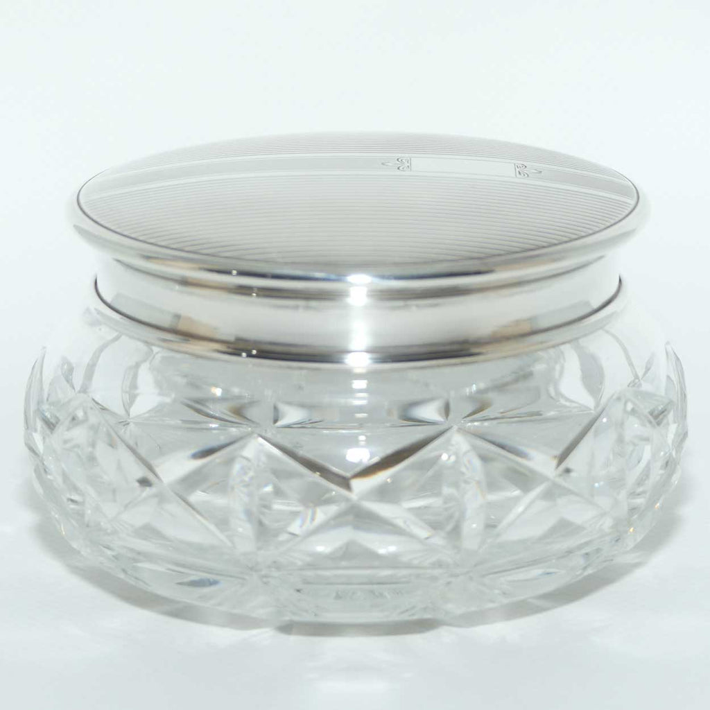 The Engine Turned lid is Sterling Silver, the base is heavy cut crystal