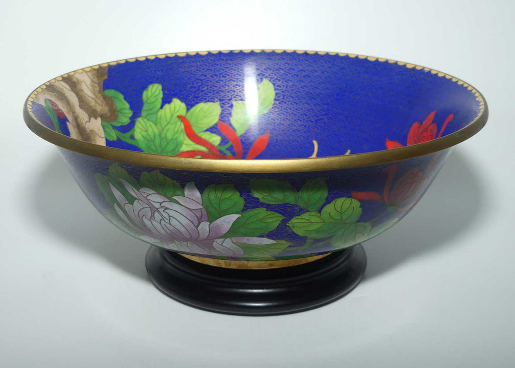 Mid Century large Chinese Cloisonne bowl on wooden stand