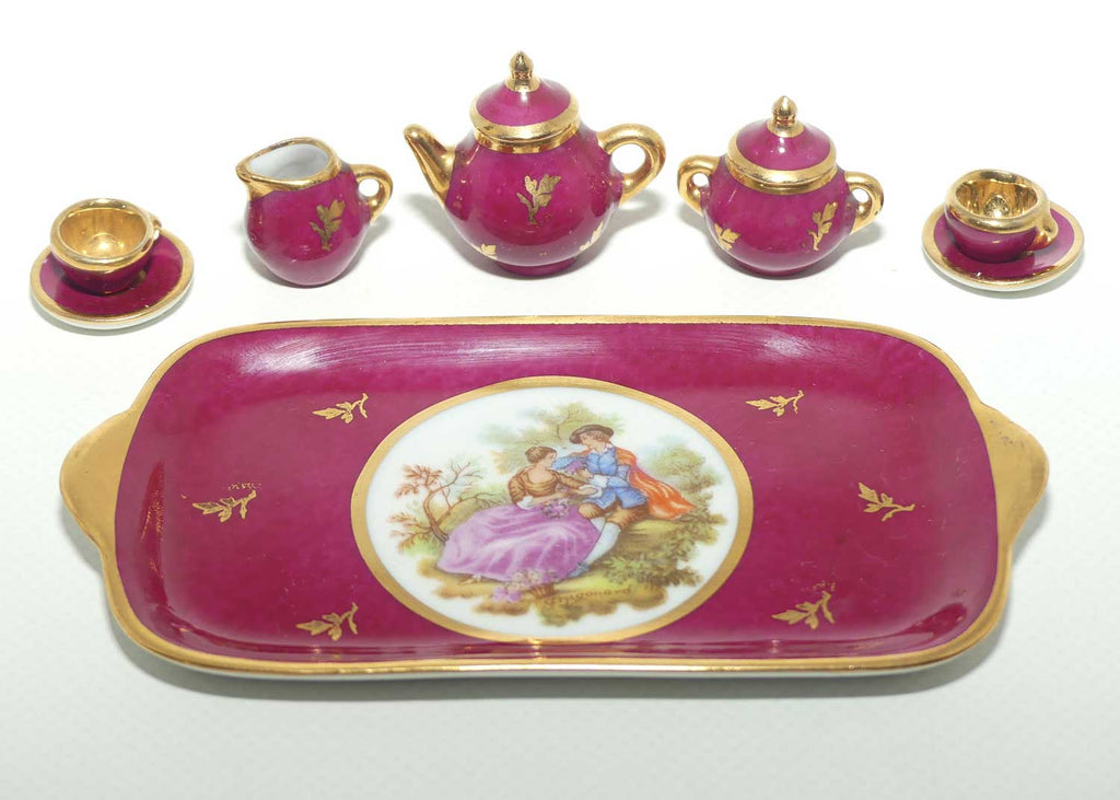 The miniature size set comprises a tray, teapot and lid, sugar bowl and lid, jug and 2 tea duos. The tray depicts a traditional courting couple scene signed Fragonard