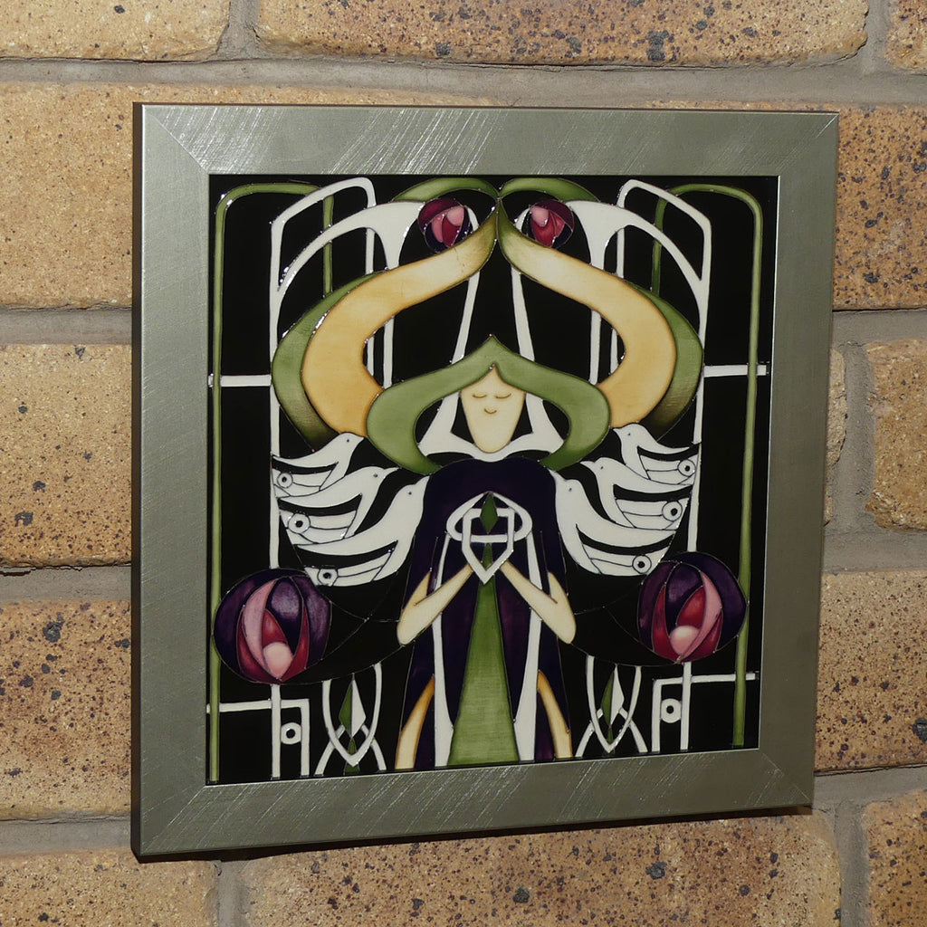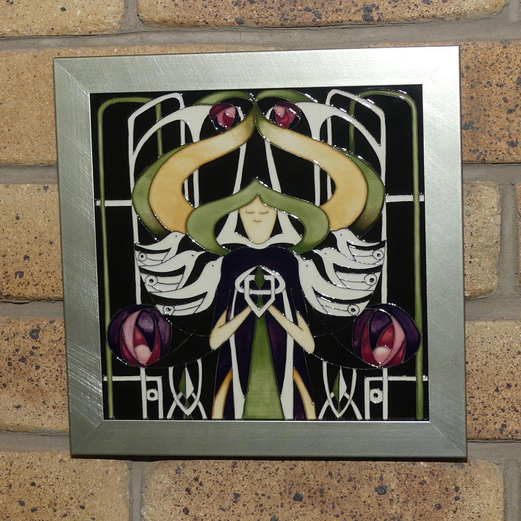 Both Mackintosh’s design and colour palette inspired designer, Nicola Slaney. Her Art Nouveau lady adorns this plaque, and appears more at peace than Mackintosh’s, who appears almost imprisoned by the birds and linework of the original design. Purple, plum, green and gold are the colours of choice for Nicola.
