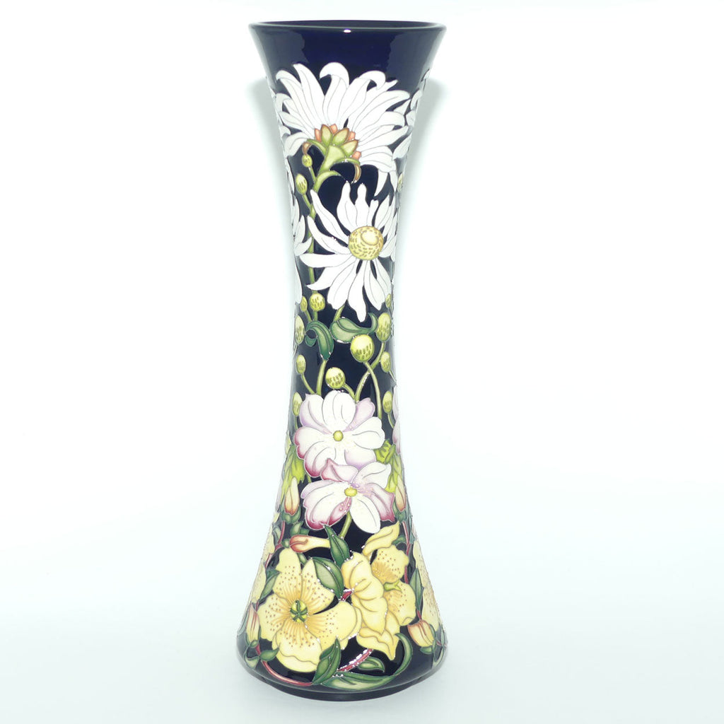 The lead piece in the Sir Harold Hillier Collection, on the elegant 365/15 shape is Rachel at her best. The Hypericum sits comfortably at the base of the vase complete with golden yellow flowers and reddish stamens which merge into Anemone ‘Wild Swan’ with irregular shaped pure white petals, fully open set against neat green foliage. The reverse of the petals have a soft lilac tone and rounded flower buds unfold to deliver a long flowering period. A white autumn flowering Shasta daisy, Leucanthemella serotina continues to rise above in tune with the shape of the vase to complete the picture against a background of Moorcroft blue.