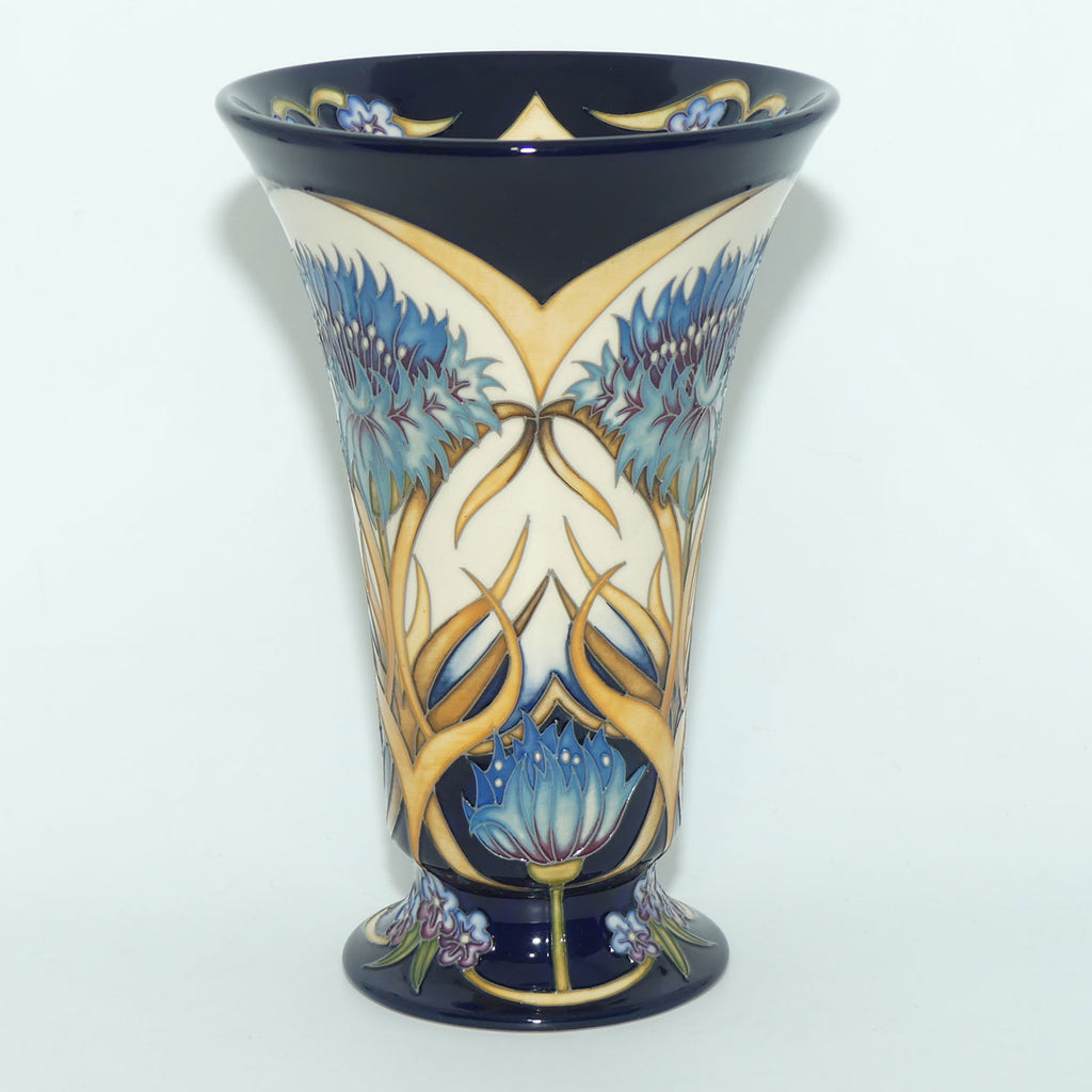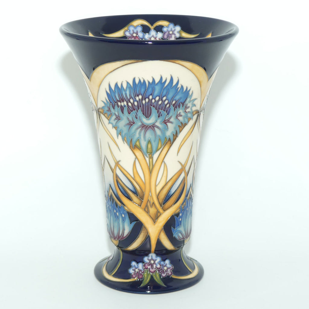 A contemporary take of a traditional Moorcroft Cornflower pattern. This is an exceptionally well priced Limited Edition, with the added bonus of being decorated outside and inside the mouth of the vase in a traditional Florian inspired design.