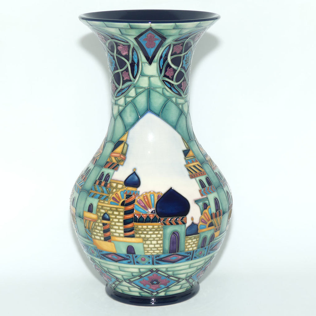 Previously we have seen Beverley Wilkes transform the ancient city of Alhambra into a Moorcroft Limited Edition [currently in stock | click here]. So successful was the limited edition that a prestige version was later introduced. In 2011, Beverley has drawn her inspiration, this time not from a red fort, but from the red city of Marrakech, near the foothills of the snow-capped Atlas Mountains. Her focus on the ‘Medina’, the old fortified city, vibrant in colour and Moorish architecture, sharpened by the stories from a Halaka, the men of Marrakech who have entertained sultans and enchanted the city’s youth for centuries, passing their stories, coloured with inspired words of wisdom, from generation to generation. This oral tradition is as much under threat in the modern world as the craft skills of The Potteries. Halaka is a joyful celebration of life, a visual representation of an ancient city which allows the mind to drift into medieval squares bustling with acrobats, snake charmers, belly dancers, striking fabrics and baskets overflowing with exotic spices, and musicians, as minarets climb into the heavens above. Beverley has walked these streets, too narrow for cars, absorbed their flavour and allowed the Halaka’s stories and the cacophony of drums, reed pipes and the colour of Marrakech to penetrate her soul. In much the same way as the Halaka’s pass the spirit of the city to each new generation, Moorcroft’s hope is that Beverley’s Halaka does exactly the same, merging visual and oral heritage into a unique piece of art. This piece is limited to an alluring 100 pieces.