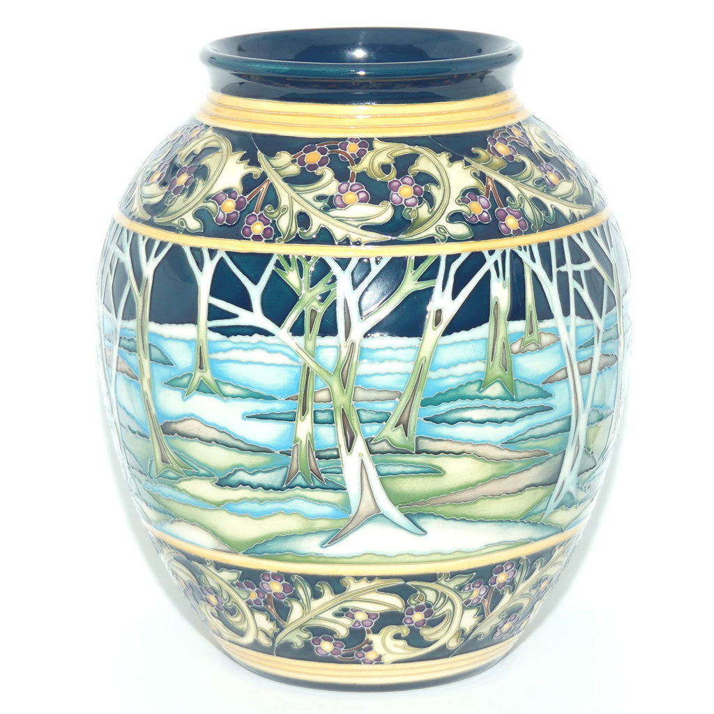 About Moonshine: Inspired by Morris & Co.'s San Graal Tapestries, Moonshine weaves a tapestry of wonder, through a thicket of deep blue-green trees, contained in art deco bands. Unlike the San Graal trees twist against a deep, sombre, dark-blue background, yet simultaneously give way to uplifting, cool, fresh pale blue waters. Within a trinity of gold bands, burgundy forget-me-nots from the tapestry's frieze by Henry Deale, add vibrant colour and energy to the design. Whilst the darkness still lingers beyond the trees, it does not affect the flow of life which permeates through the design. Kerry's work holds echoes of mysteries. For the Moorcroft designer, simplicity if found in a story told simply through the forget-me-nots and the depth and contrast of colour and form permeating through the design. With hope, Kerry Goodwin's work has been created with the wisdom that life is held together, and stories are woven, by divine truth alone.
