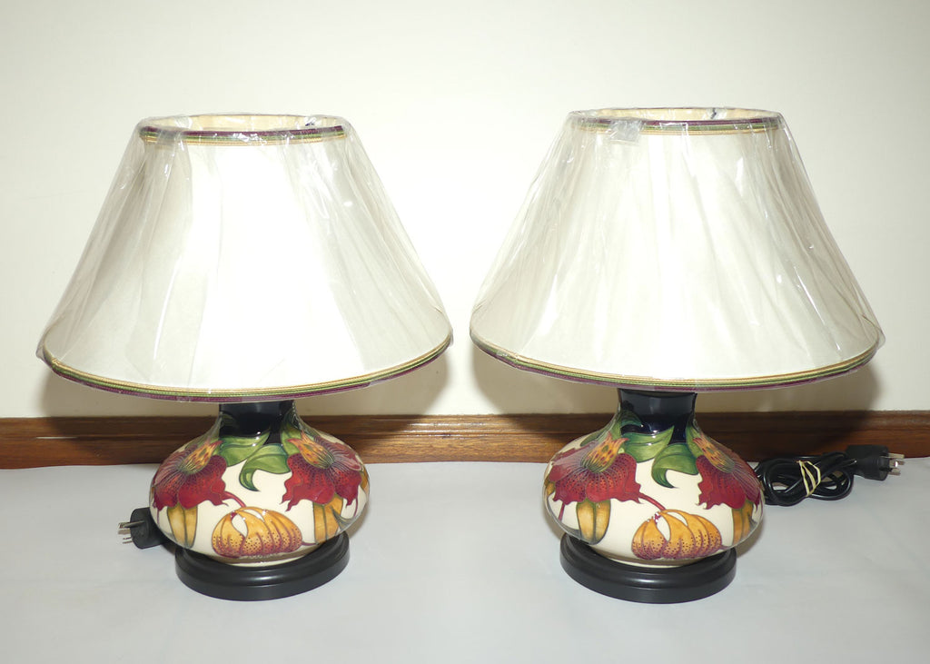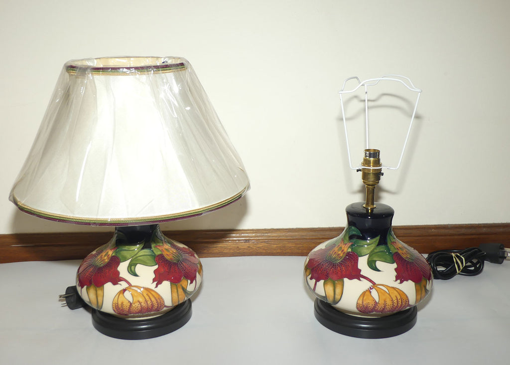 Moorcroft pair of table lamps and matching F11 Moorcroft Silk Shades