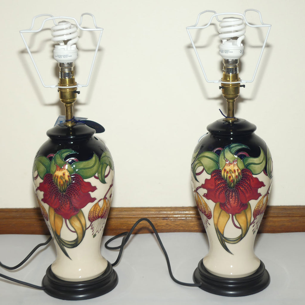 Moorcroft pair of table lamps and matching D11 Moorcroft Silk Shades