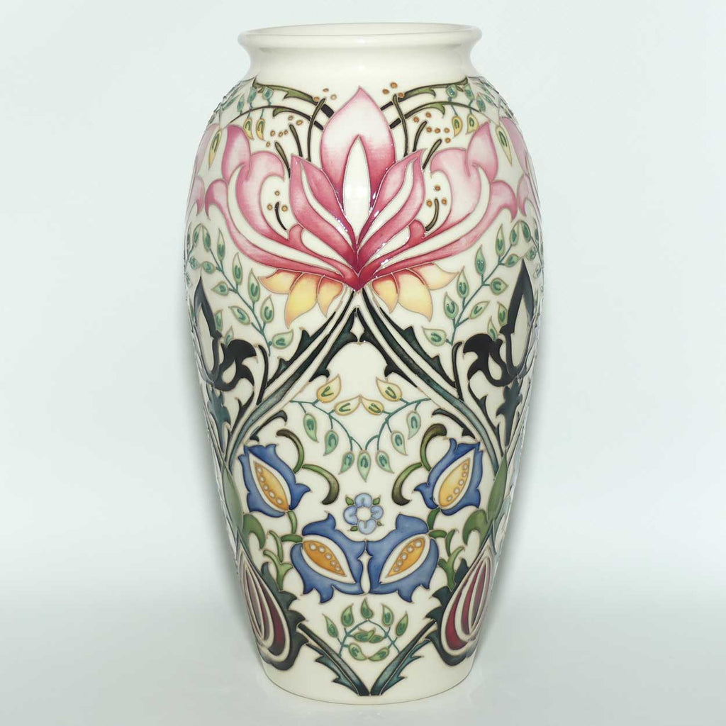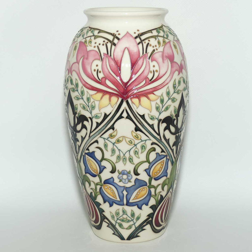 In 1904, John Henry Dearle created his Persian wallpaper. He chose to incorporate into the complex symmetrical pattern a variety of flowers in shades of blue, green and pink on a pale ground. The paper was produced by Morris & Co, the famous Arts and Crafts manufacturer. Emma too wanted her design to be set against an ivory ground to simulate the format that Dearle used, allowing the surface pattern to speak for itself. A large pink flower unfurls its petals centre stage, while smaller blue and yellow flowers band together for great effect, and onion shaped striped plants support the base of the design. A tubeliner’s agility is greatly tested in this design with myriad tiny leaves in a variety of shades of green being interwoven amongst the fantastical flowers and plants of Emma’s imagination.