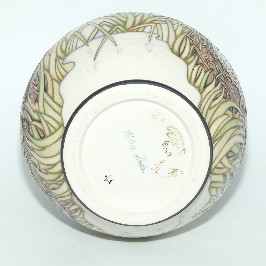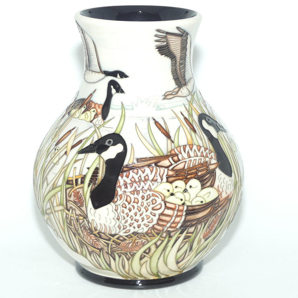 Disappear into the world of the Canada goose, as the pearl-grey underparts of their elongated bodies rise up in graceful formation with vast wings outstretched and their characteristic black heads, white cheek patches, and long black necks, over a wetland home. Complete with newly hatched goslings, nestled closely together against their mother’s goose-down warmth, this wetland scene requires close examination. In a matter of months these hatchlings will be indistinguishable from their parents and they will join their peers, delightfully depicted by Helen, diving, waddling, and nesting among reeds.