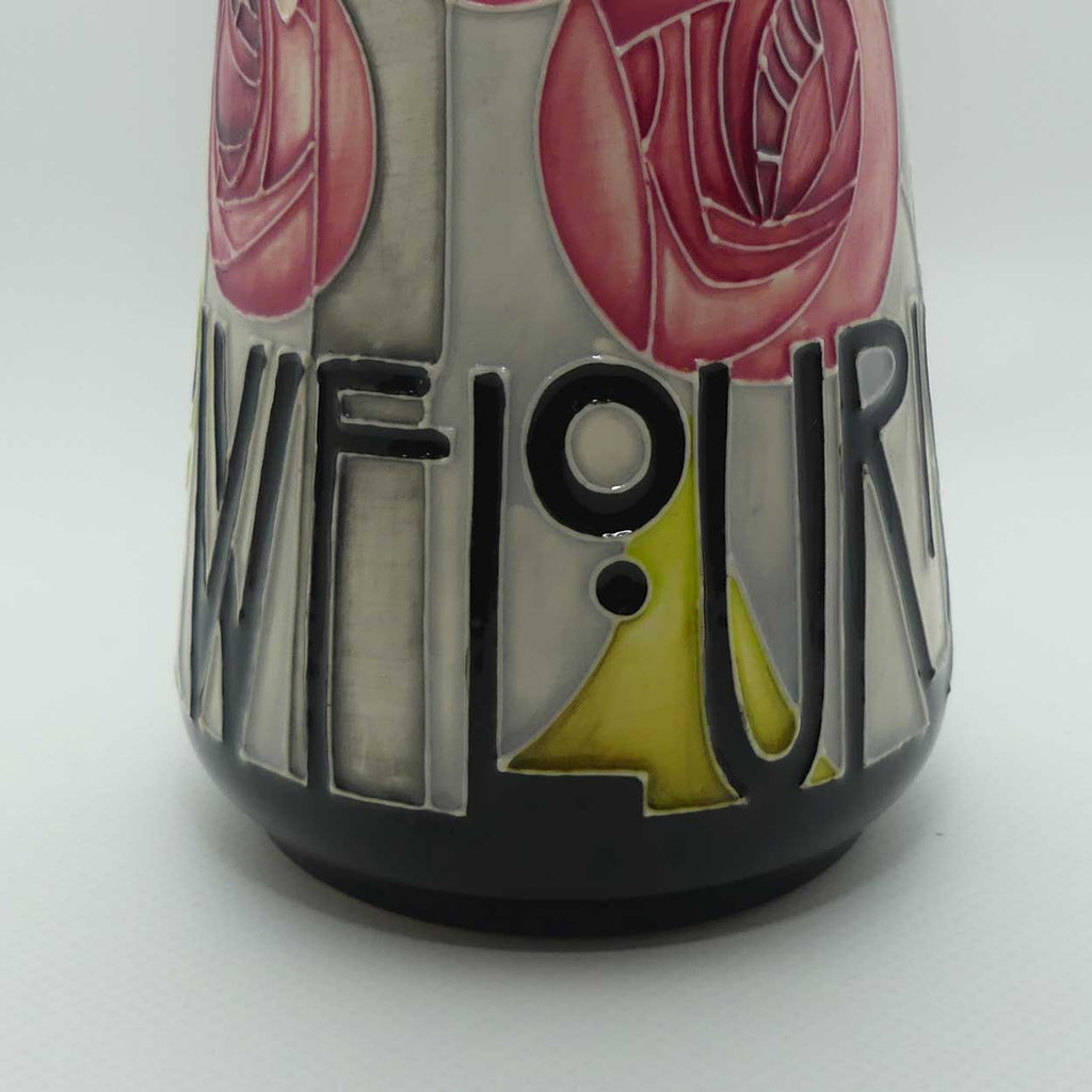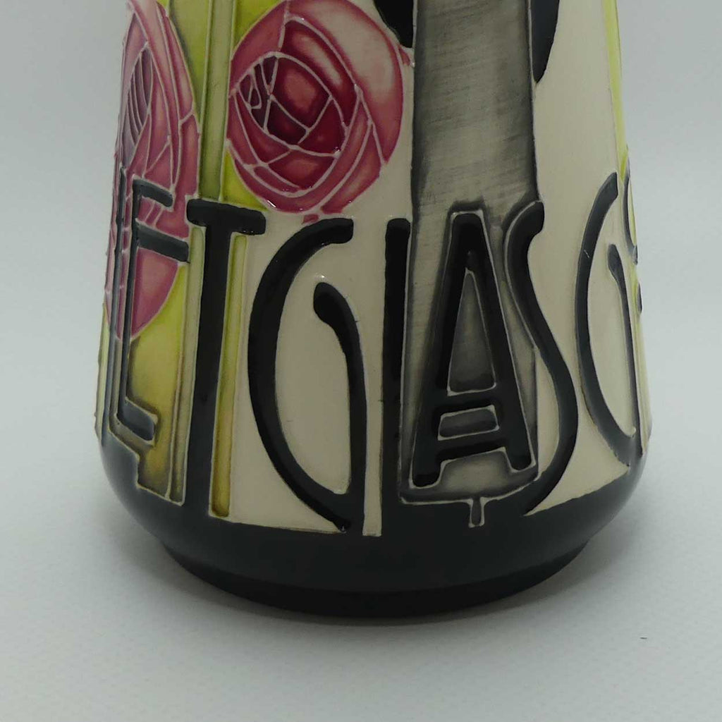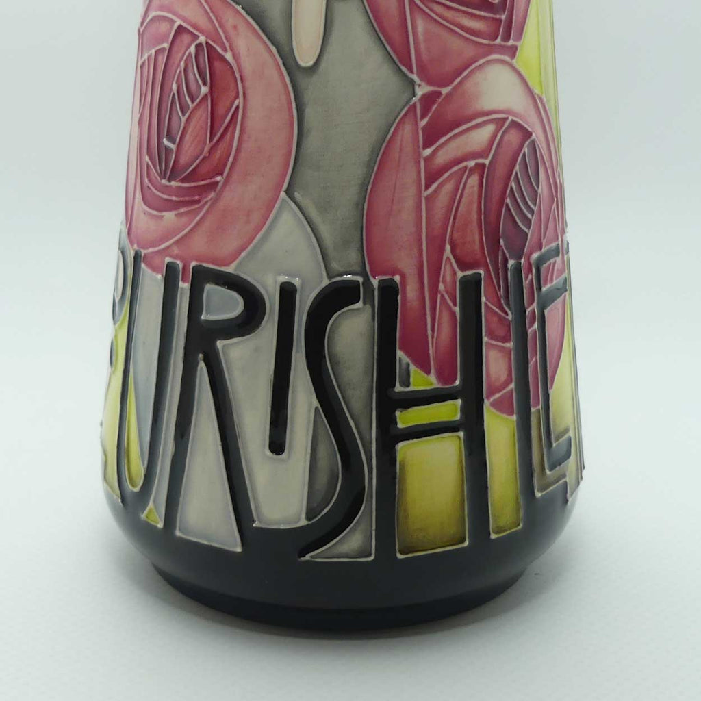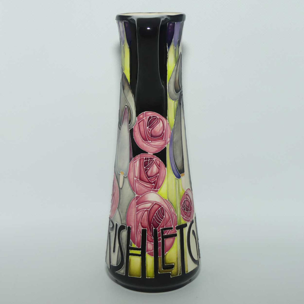 The upper floors contained a smoking and billiards room for gentlemen, while the crowning jewel of the Willow, the Salon de Luxe – a lavender and silver-toned tea room, intended to appeal to a female clientele – took pride of place on the first floor of the building, taking full advantage of the northern light from Mackintosh’s new stained-glass bow window. Margaret Macdonald's Gesso panel in the Salon de Luxe, held a sculptural relief showing a woman among willow trees. It just so happens that one of Charles and Margaret's favourite poets and painters was Dante Gabriel Rossetti, who wrote the sonnet, All ye that walk in Willowwood. Moorcroft designer, Vicky Lovatt takes Margaret’s willow lady and makes it her very own, as two very feminine wispy figures bow their heads over soft, pink Glasgow roses as their hair sweeps down in Art Nouveau waves amidst a haze of willow green where Rossetti remembers the lost lady love who just may have walked through the willow groves that once whistled in the wind before the concrete pavements of Sauchiehall Street were laid down. The reverse of the classic art nouveau shaped jug features the delicate face of Rossetti’s willow lady love. In truth, it is this design that epitomises the love and wonderful gifts the Mackintosh couple gave to each other and the Applied Arts. In remembrance, and with added poignancy following the tragic second fire at the Glasgow School of Art, the words ‘Let Glasgow Flourish’ are found around the base of the jug.