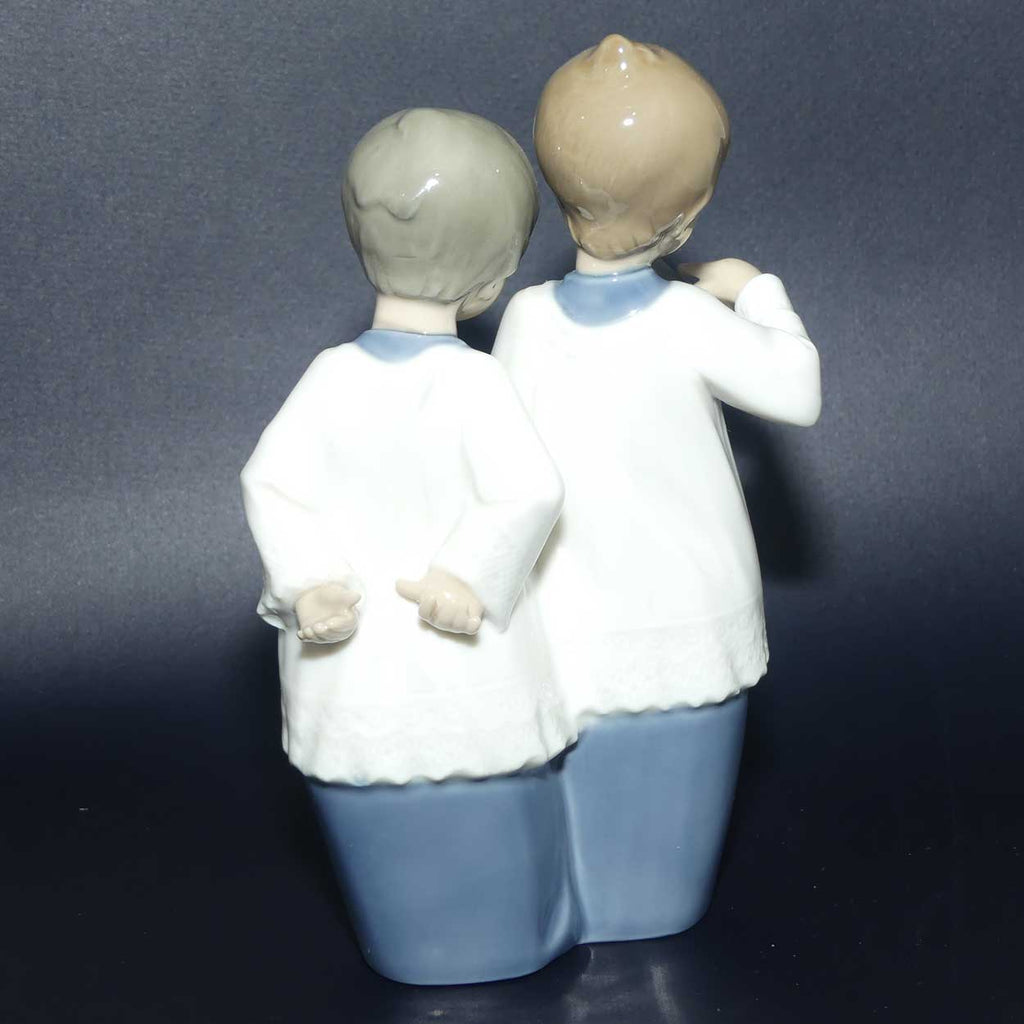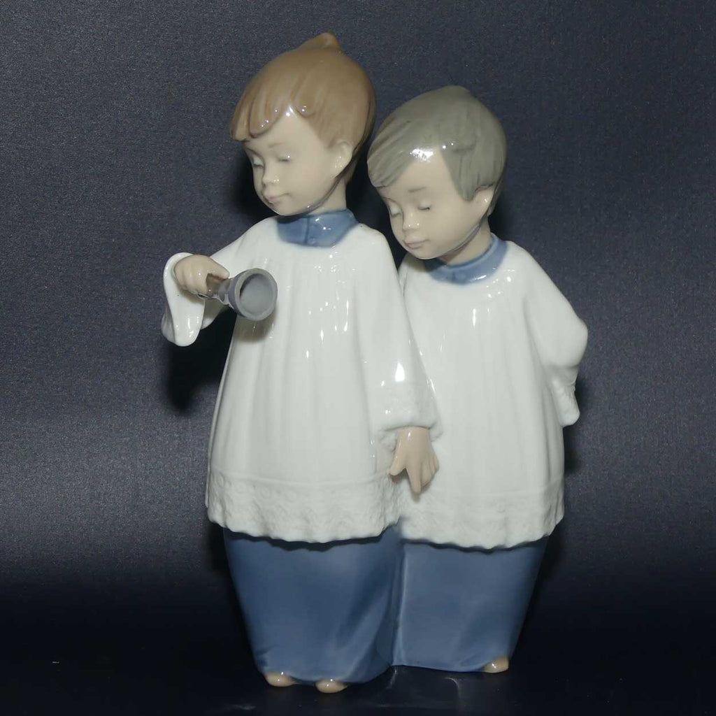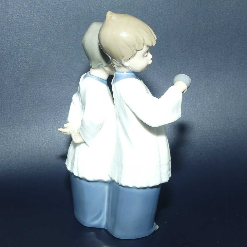 The bell in the choir boys hand is glued on - this is the way the piece was made in the factory (the figure was made and the bell glued into the boys hand - to keep production design simple and cost effective)