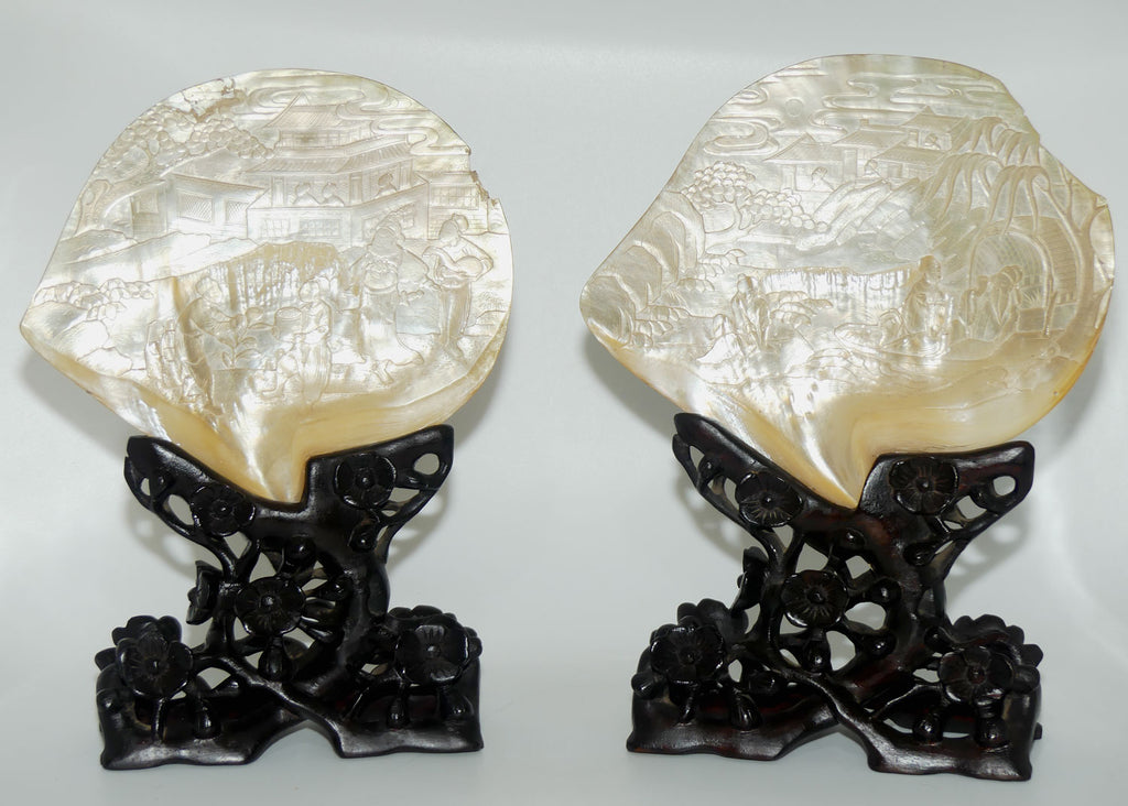 The stands are carved Cherry Blossoms - on a Rosewood base and are quite magnificent. The shells depict intricately carved Cameo style scenes - one is a Nobleman and his attendees in a Market Village trading scene; the other depicts Villagers attending to an old Man in a small hut by a River
