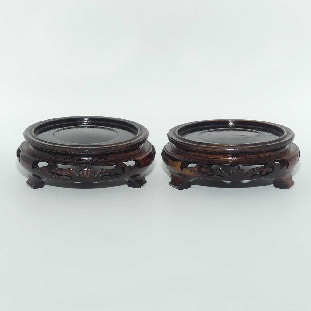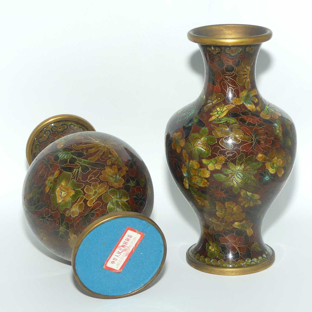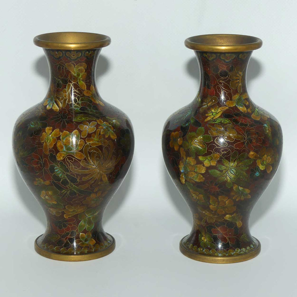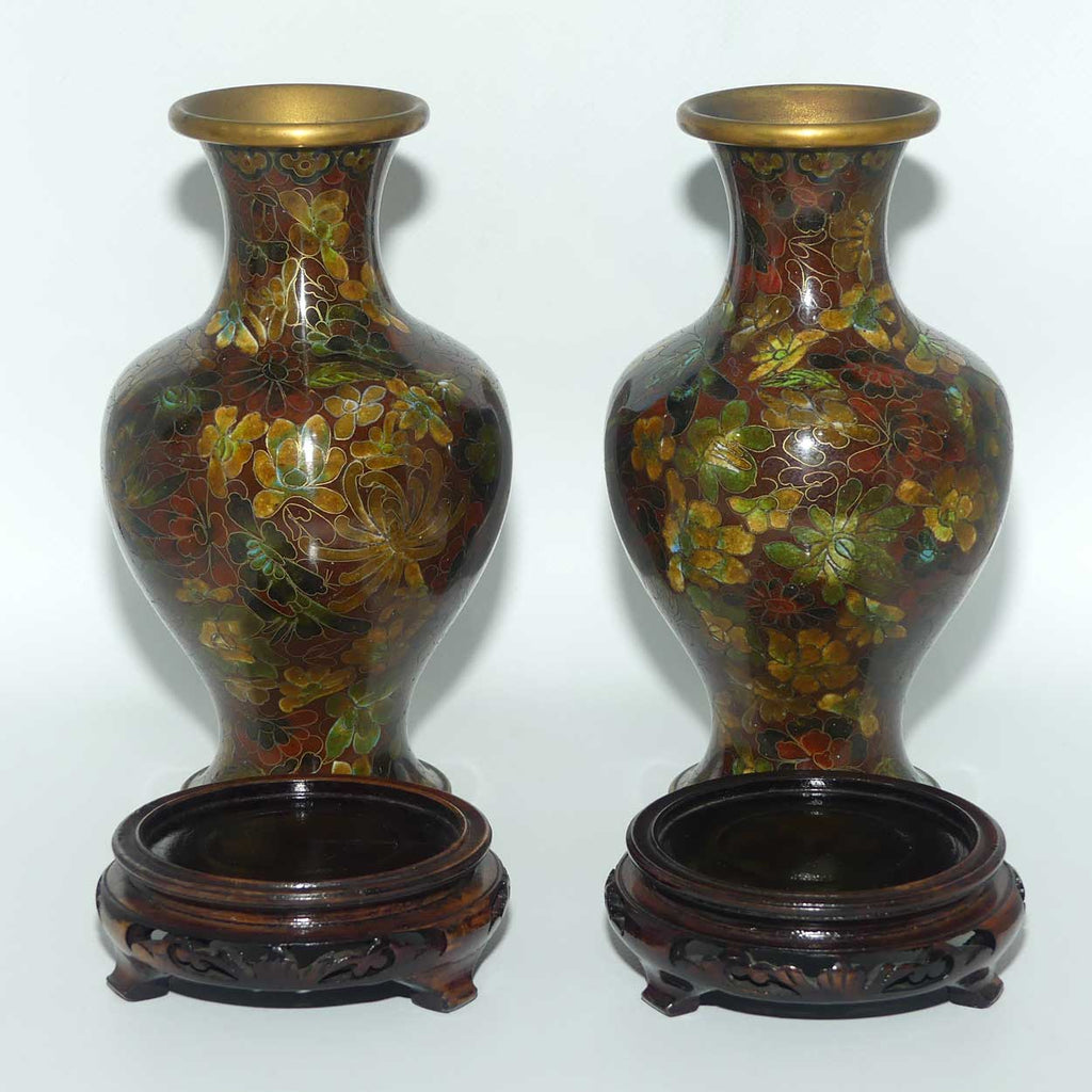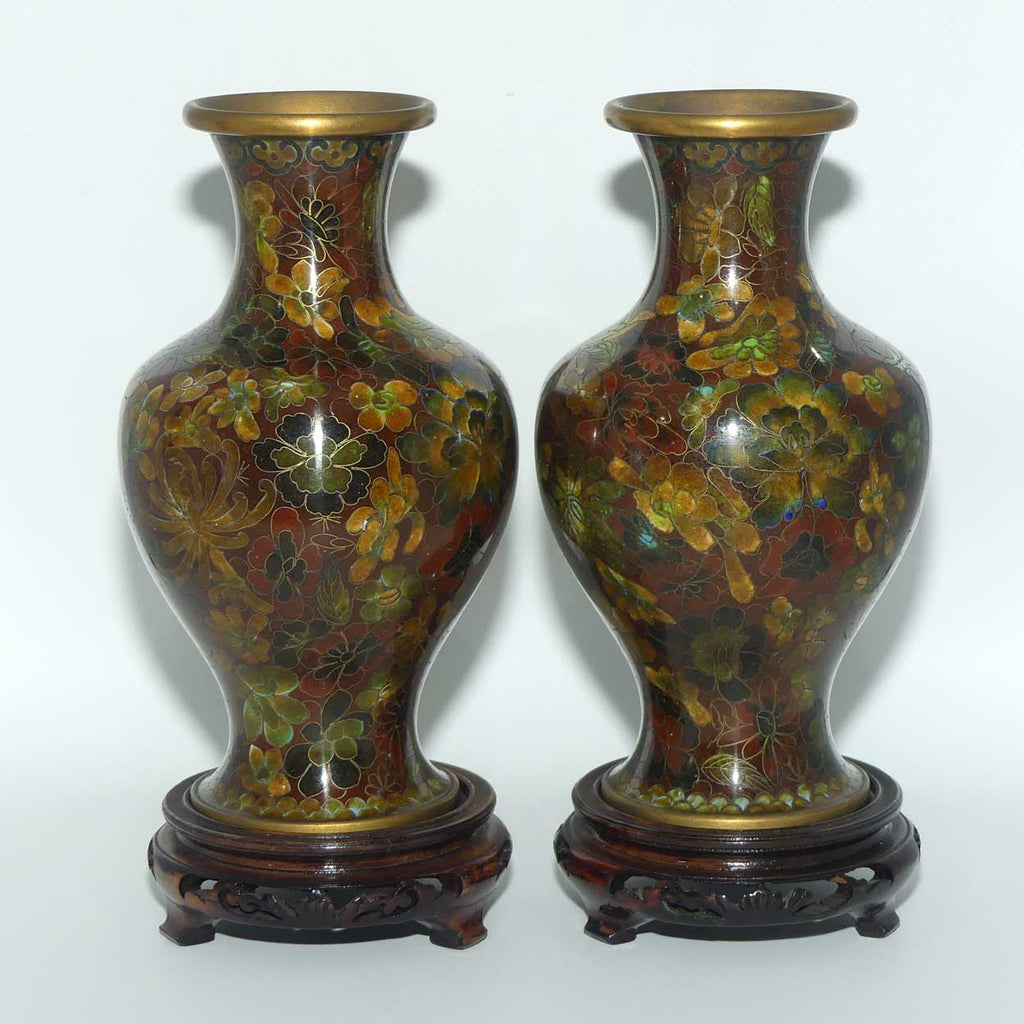 Pair of Red Brown with Green Tints Cloisonne Vases on wooden stands