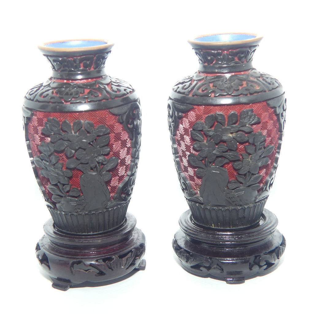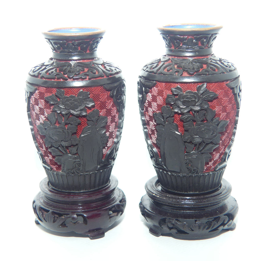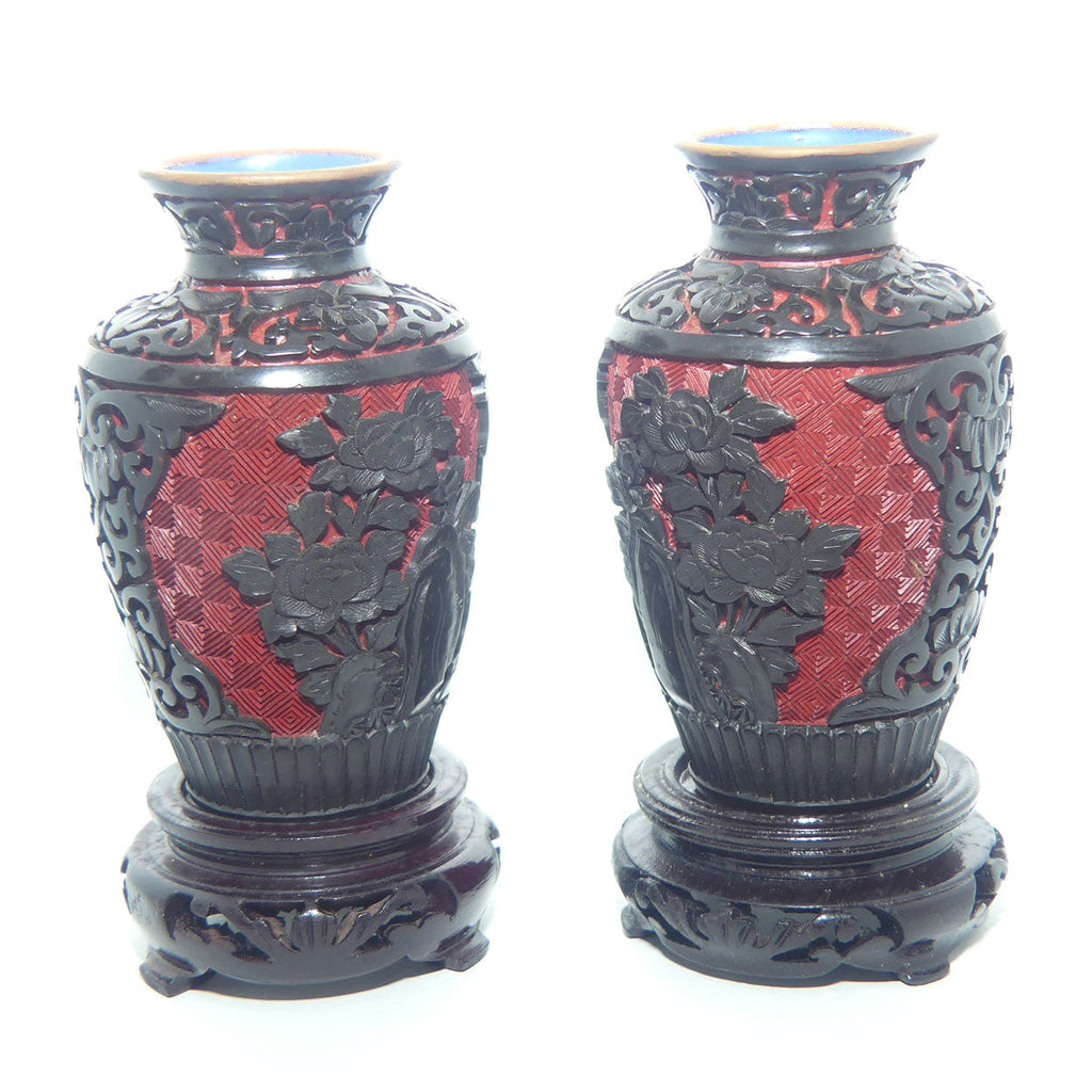 Pair of Vintage Chinese Hand Carved Cinnabar vases on Wooden stands