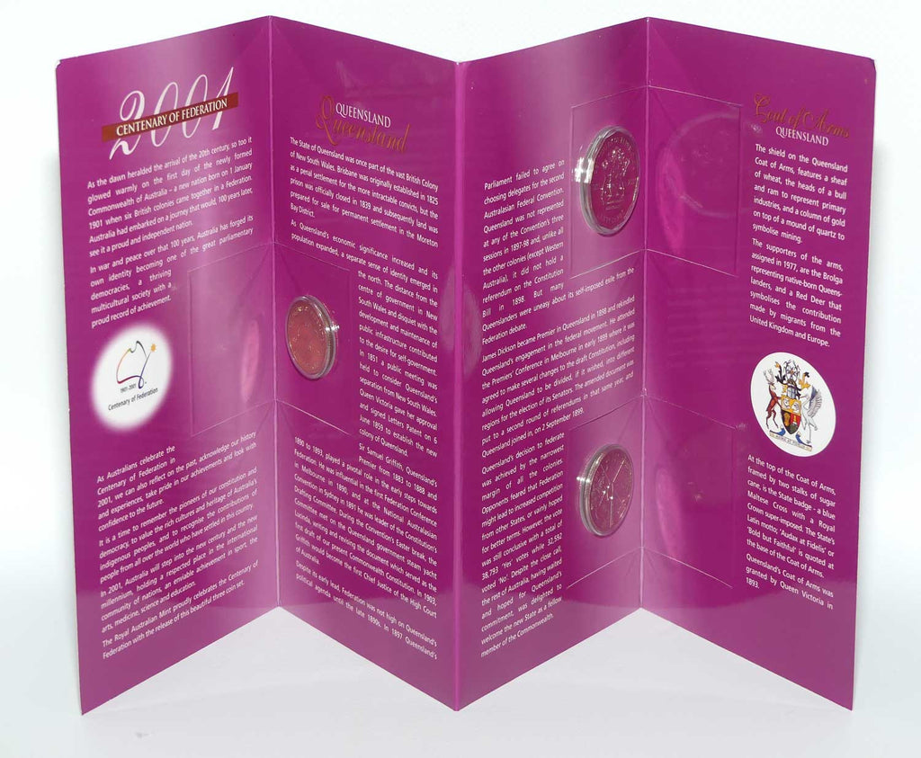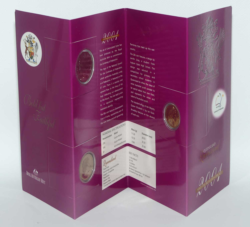 Features 3 Uncirculated coins including [Alum Bronze] Specially Struck $1 for the Centenary of Federation 1901 - 2001 featuring the logo of the National Council for the Centenary of Federation, and [Cupro Nickel] Specially Struck 50c for the Centenary of Federation with the Coat of Arms for Queensland and the Specially Struck 20c features a design by Jenifer Grey, a student from Ingham State High School - to reflect the ideas of what youth consider to be special about their own state.