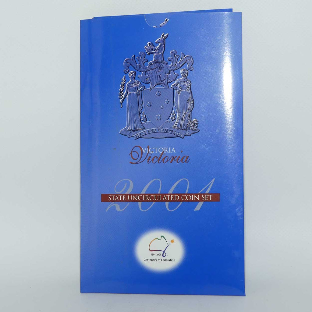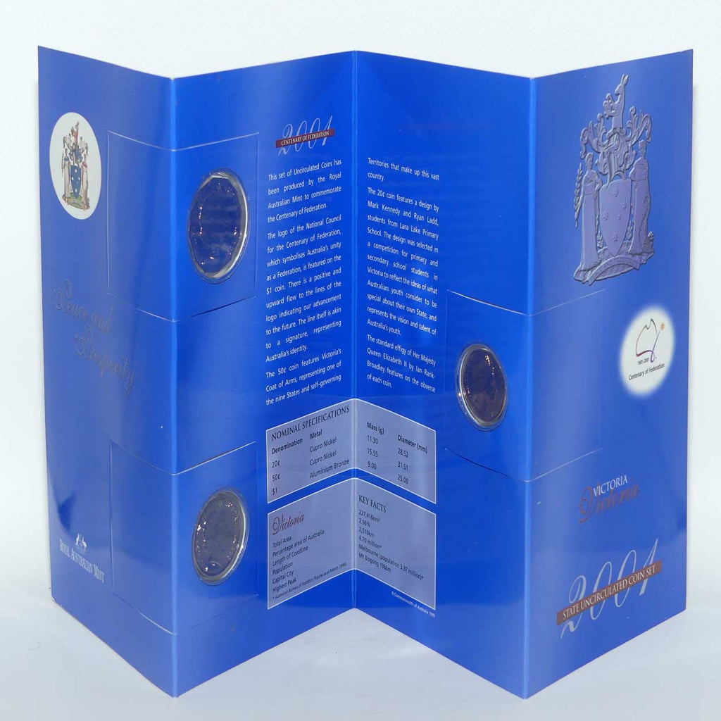 Features 3 Uncirculated coins including [Alum Bronze] Specially Struck $1 for the Centenary of Federation 1901 - 2001 featuring the logo of the National Council for the Centenary of Federation, and [Cupro Nickel] Specially Struck 50c for the Centenary of Federation with the Coat of Arms for Victoria and the Specially Struck 20c features a design by Mark Kennedy and Ryan Ladd, students from Lara Lake Primary School. The design was selected in a competition for primary and secondary students in Victoria to reflect the ideas about what Australian youth consider to be special about their own state, and represents the vision and talent of Australia's youth.