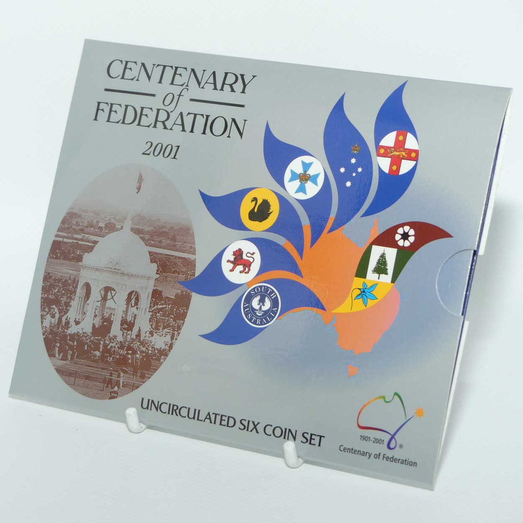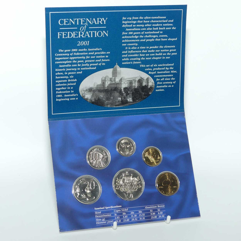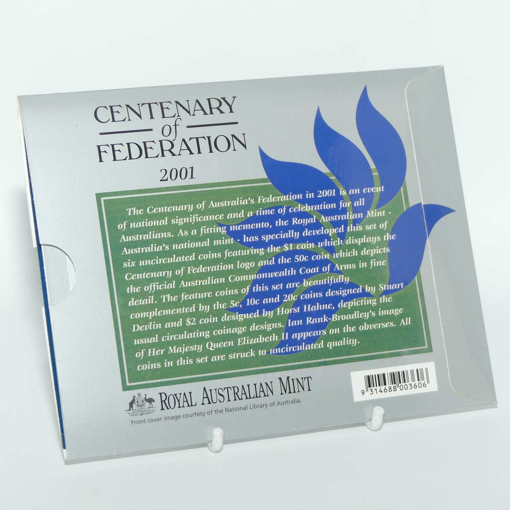 The Centenary of Australia's Federation in 2001 is an event of national significance and a time of celebration for all Australians. As a fitting momento, the Royal Australian Mint - Australia's national mint - has specially developed this set of six uncirculated coins featuring the $1 coin which displays the Centenary of Federation logo and the 50c coin which depicts the Official Coat of Arms in fine detail. The feature coins of this set are beautifully complemented by the 5c, 10c, 20c coins designed by Stuart Devlin and the $2 coin designed by Horst Hahne, depicting the usual circulating coinage designs. Ian Rank-Broadley's image of Her Majesty Queen Elizabeth II appears on the obverses. All coins in this set are struck to uncirculated quality.