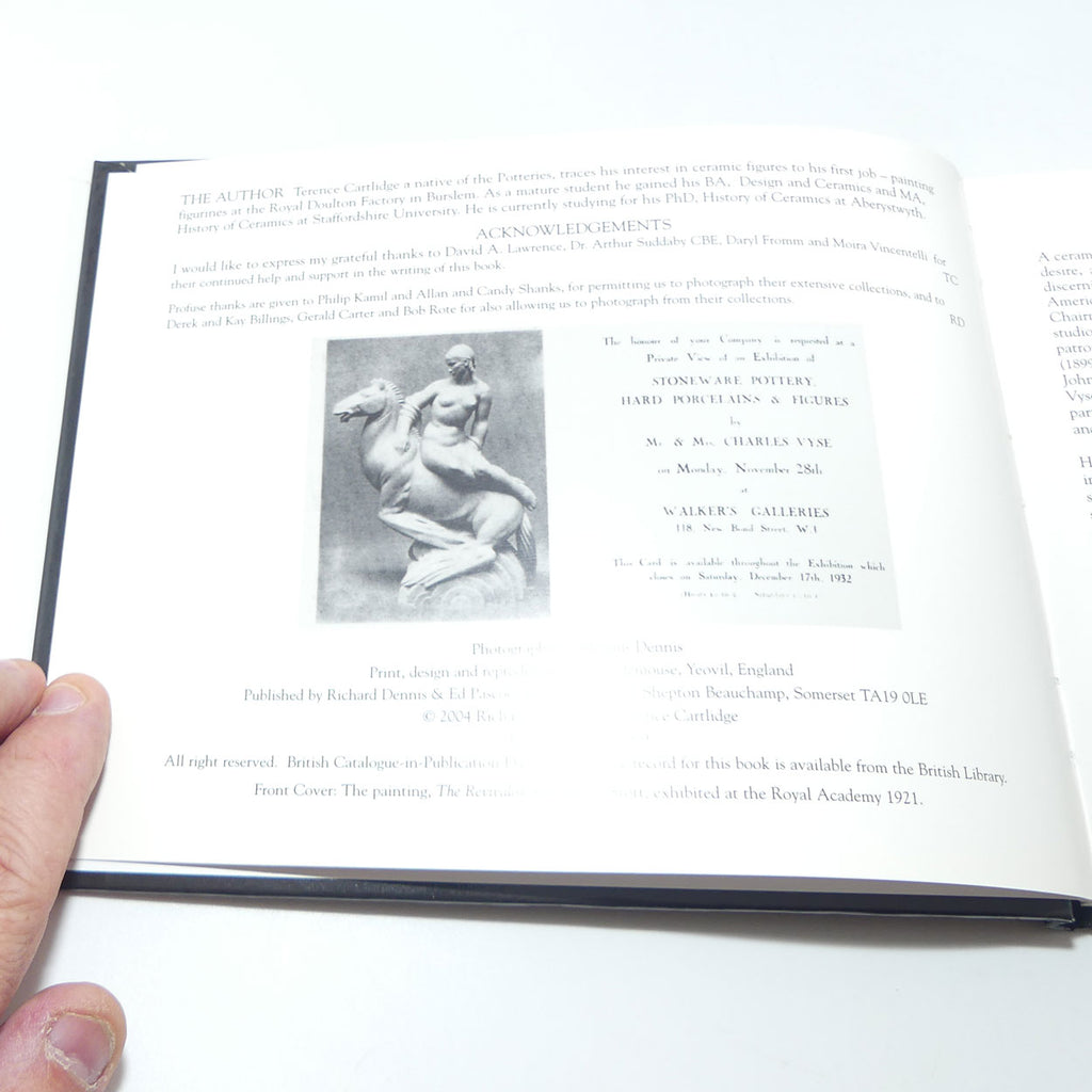 Charles Vyse served an apprenticeship as a modeller and designer at Doulton's, 1896 and later studied at Hanley Art School and sculpture at the Royal College of Art, 1905-10. He worked first as a portrait and figurative sculptor before setting up a pottery studio in 1919 in Cheyne Walk, Chelsea, with his wife Nell who was especially knowledgeable about glaze chemistry. They produced colorfully decorated figures many of London characters, such as the 'Balloon Girl' and 'Barnet Fair'. After 1923 they experimented with high-fired wares and revived Chinese glaze techniques particularly chun and tenmoku glazes. During the 1930s they also produced contemporary designs with geometric patterns and calligraphy. Throughout that decade they sold mainly through Walker's Gallery in Bond Street where they had an annual exhibition every November. Around 1940 the couple separated and Nell Vyse gave up ceramics. After the studio was damaged in the blitz in 1940 Charles Vyse taught at Farnham School of Art. He later worked with a former student, Barbara Waller, before retiring to Deal, Kent, in 1963.