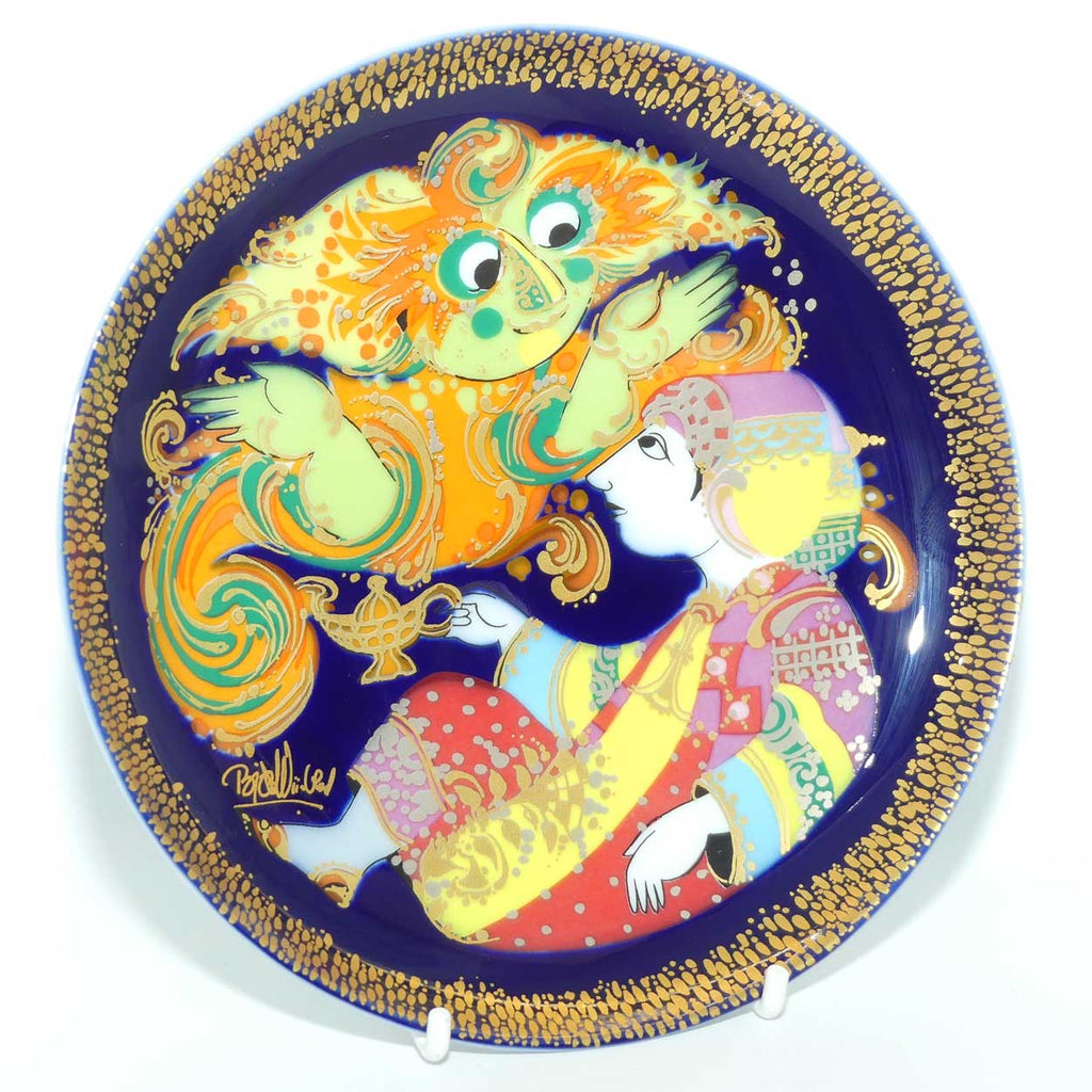 This is the first of the twelve Aladdin plates, titled Aladdin and the Magical Lamp. The plate is the Title motif of the Aladdin series and depicts Aladdin talking to the Spirit of the lamp, who fulfills all of Aladdin's wishes.