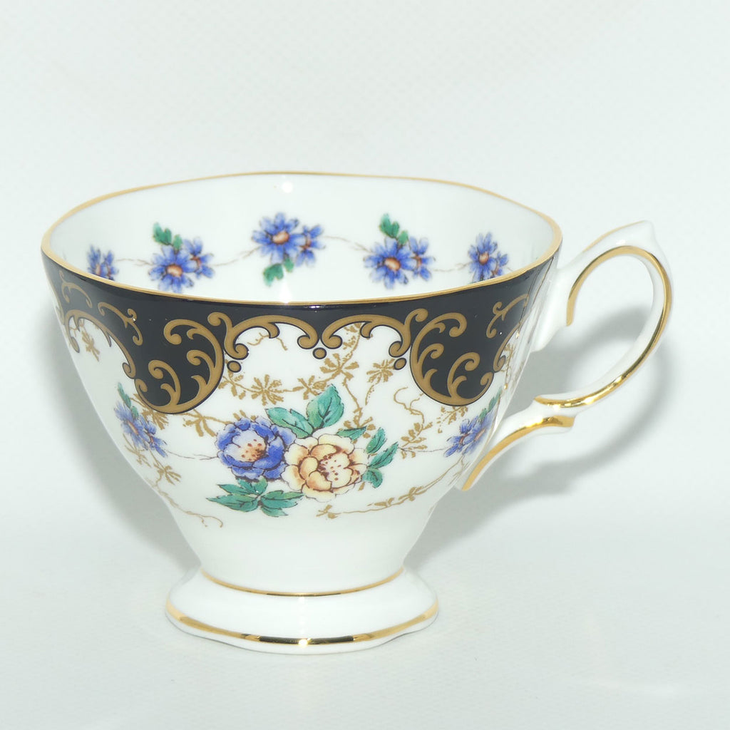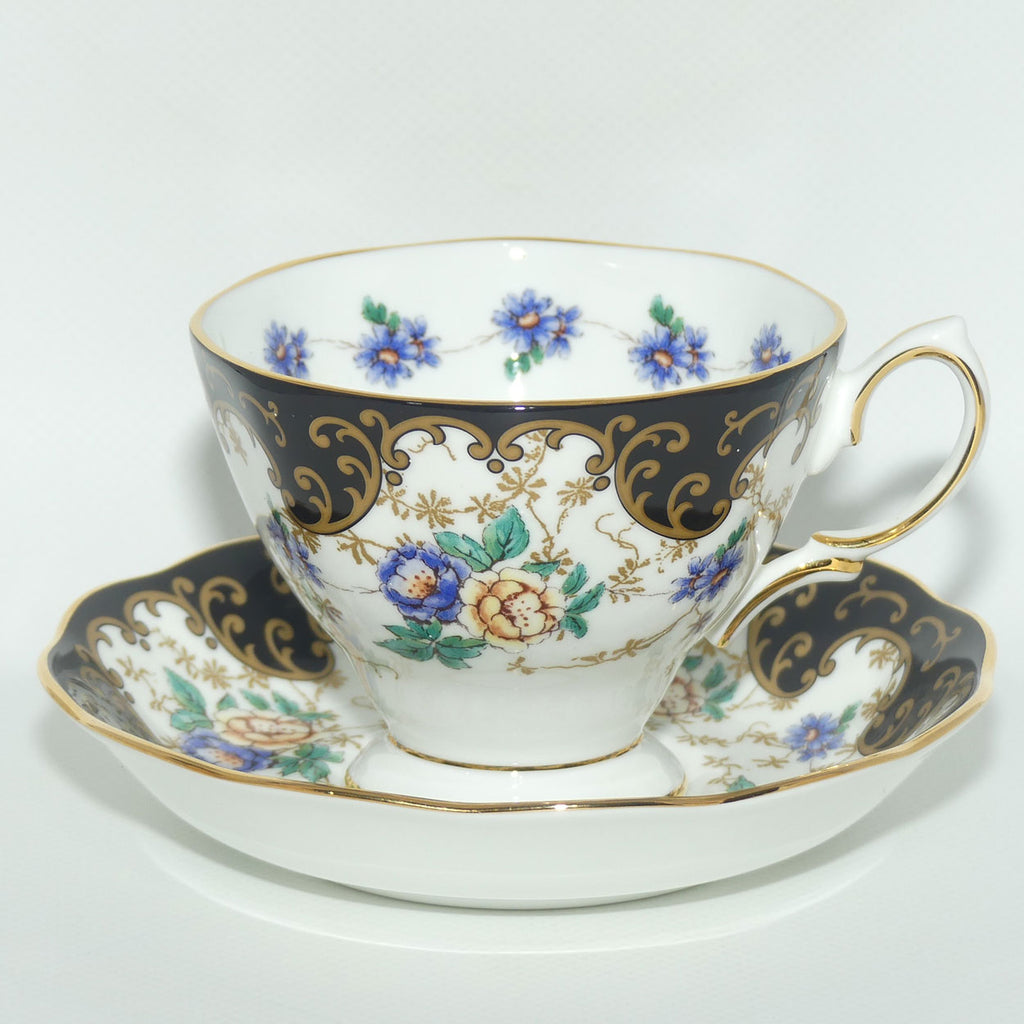 About this Pattern: Many decorative styles including Rococo remained popular into the 20th century. A rich black border with swags of yellow and lavender roses, set among soft green leaves and interspersed with asters are linked by delicate golden daisies.