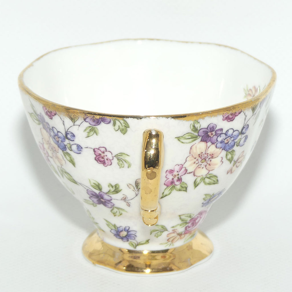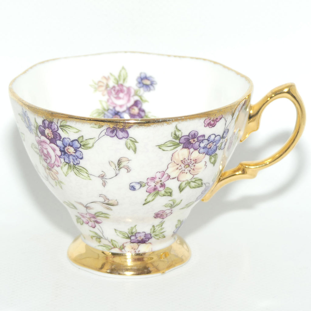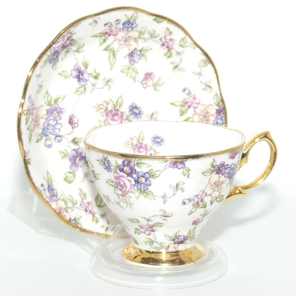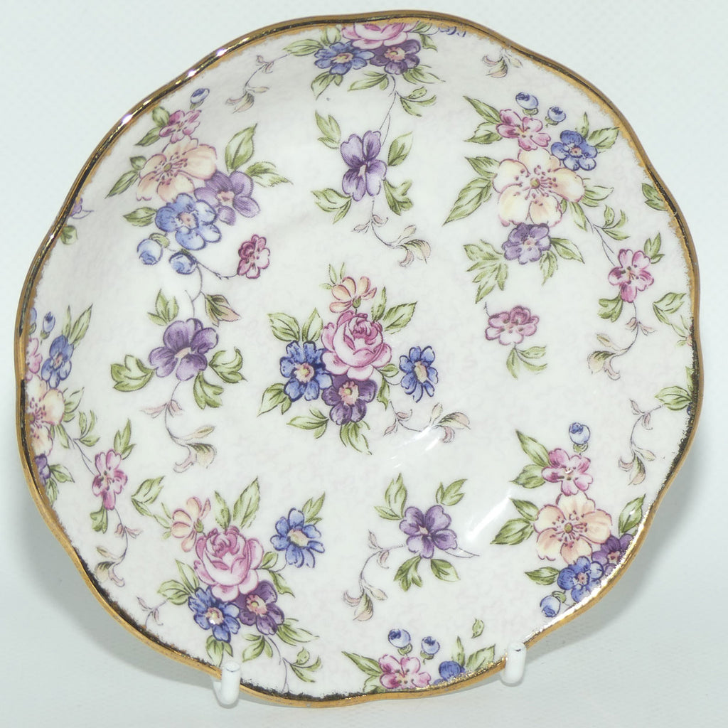 About this Pattern: In ceramics, a chintz pattern is one where the whole surface of a shape is totally covered by the decoration [generally floral] to create a design that celebrates colour and image. Pretty pink roses, dainty forget-me-nots and green leaves on a crackle effect background create the epitome of the Royal Albert floral tradition.