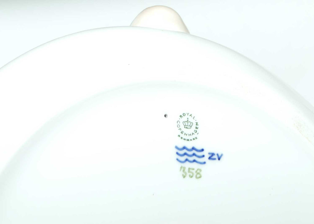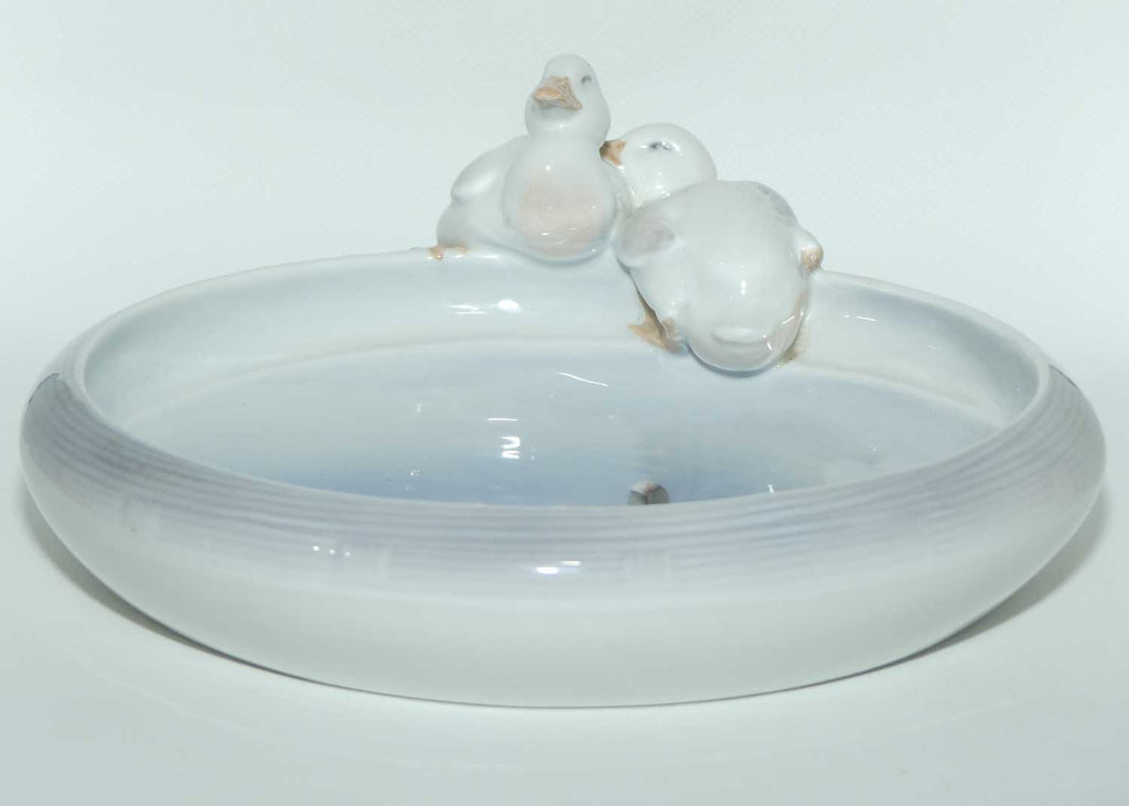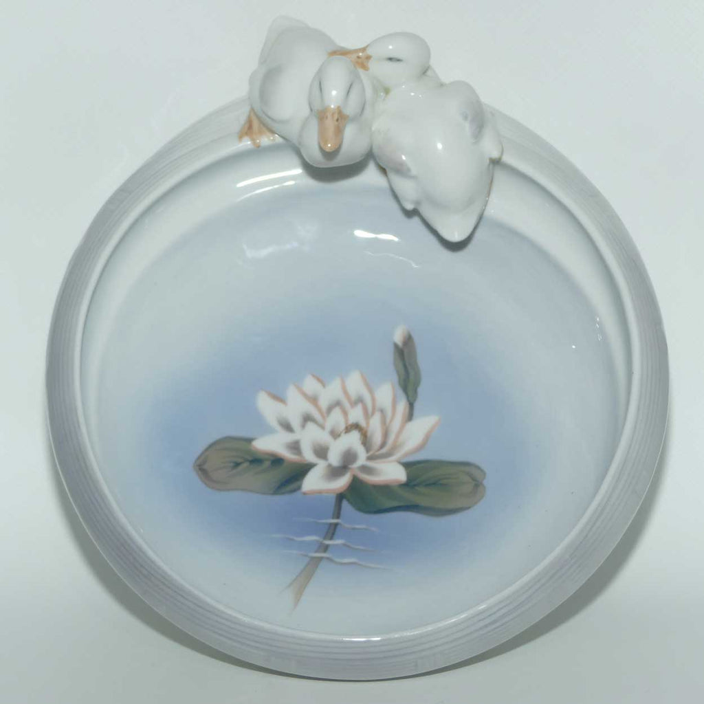 Atop the edge of the bowl are 2 Ducks [they are fixed to the piece] - the centre has a Water Lily which gives an Art Nouveau feel to the design. Around the outside of the bowl is a basket weave style pattern. it really is one of the nicest pieces of Copenhagen we have seen in many a year