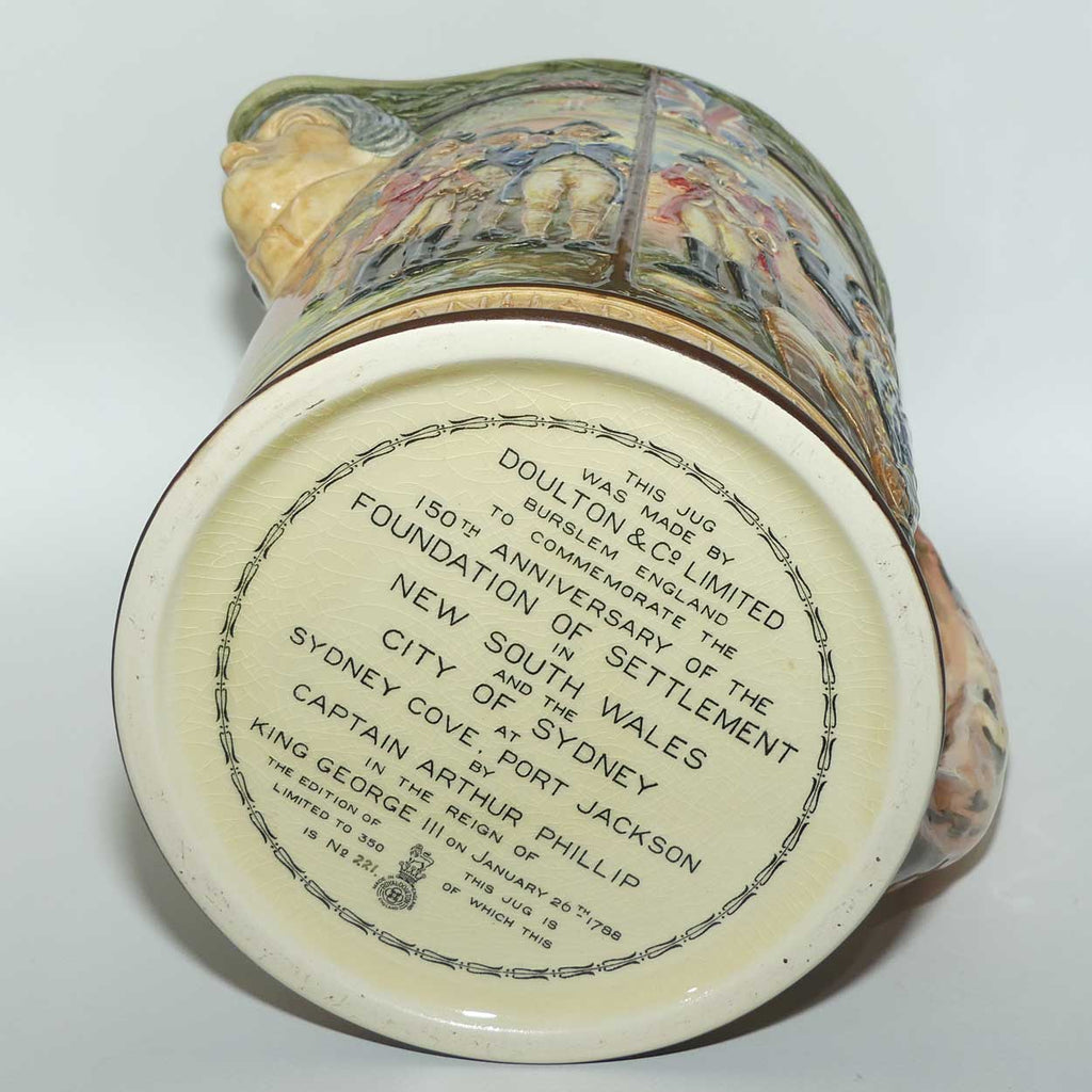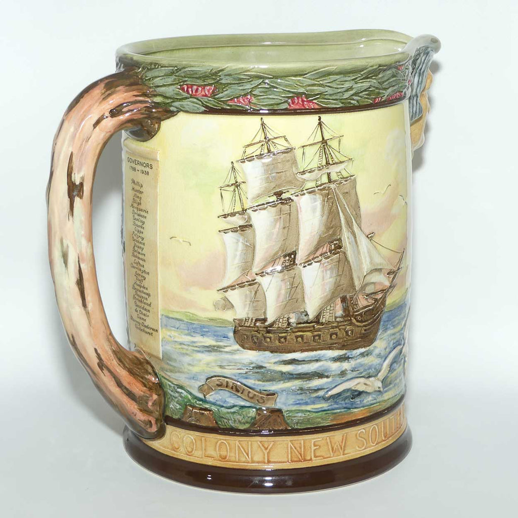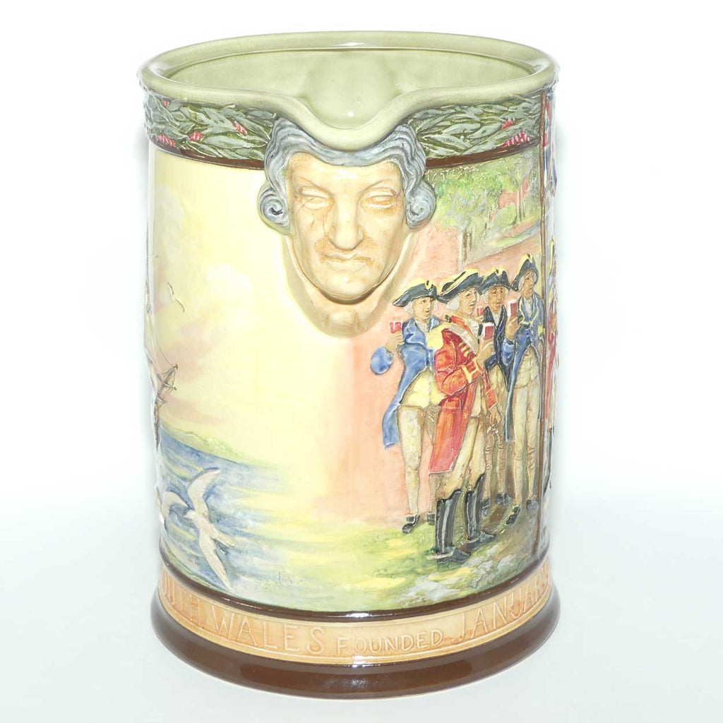 The jug depicts the flagship "Sirius" sailing to Australia and Captain Phillip with his officers on shore toasting the flag. The lip of the jug is modelled as a ask of his head, with around the bottom the words COLONY NEW SOUTH WALES FOUNDED JANUARY 1788 SYDNEY. A band of eucalyptus leaves adorns the rim while underneath the handle is a list of the governors from Phillip to Wakehurst in 1938.
