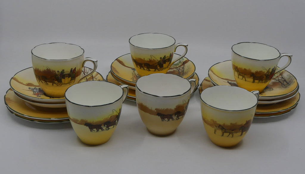 It is very uncommon to find 6 trios as a "set" - some 90+ years after the product was originally made | the set comprises 6 cups, 6 saucers and 6 plates and they all match for shape and design | there are numerous scenes depicted within the set but this is normal for seriesware | read more here