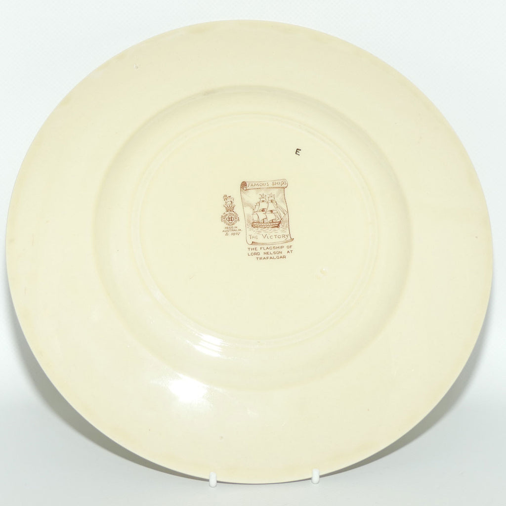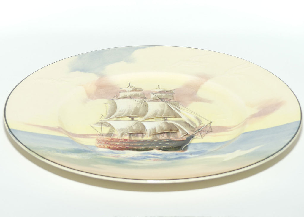 Many famous sailing ships are represented in this embossed, low relief series - which reflects the British fascination with the sea - and bears a special backstamp. In total 17 ships are depicted on various shapes. The HMS Victory depicted here, is a 104-gun first-rate wooden sailing ship of the line. With 247 years of service as of 2025, she is the world's oldest naval vessel still in commission. When Admiral Horatio Nelson was appointed Commander-in-Chief of the Mediterranean Fleet in 1803, he hoisted his flag aboard Victory and in 1805 took her into action at the Battle of Trafalgar