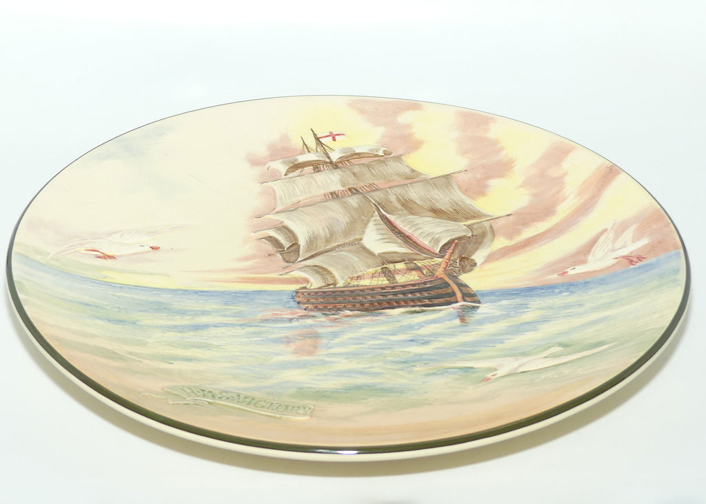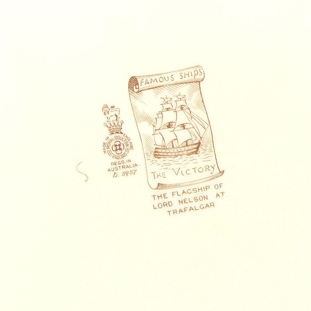 Many famous sailing ships are represented in this embossed, low relief series - which reflects the British fascination with the sea - and bears a special backstamp. In total 17 ships are depicted on various shapes. The HMS Victory depicted here, is a 104-gun first-rate wooden sailing ship of the line. With 247 years of service as of 2025, she is the world's oldest naval vessel still in commission. When Admiral Horatio Nelson was appointed Commander-in-Chief of the Mediterranean Fleet in 1803, he hoisted his flag aboard Victory and in 1805 took her into action at the Battle of Trafalgar.