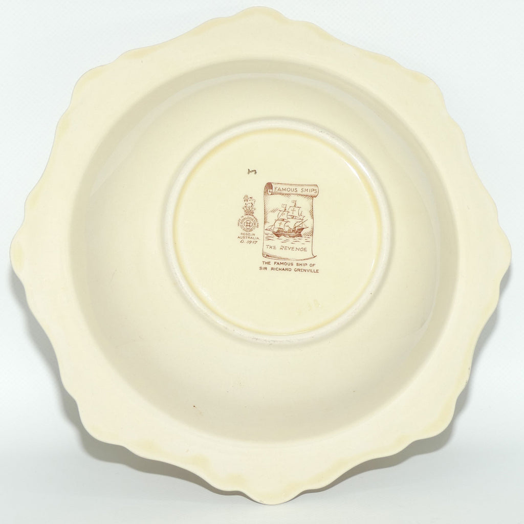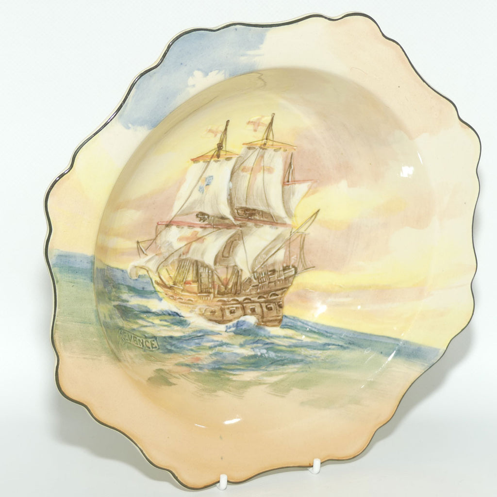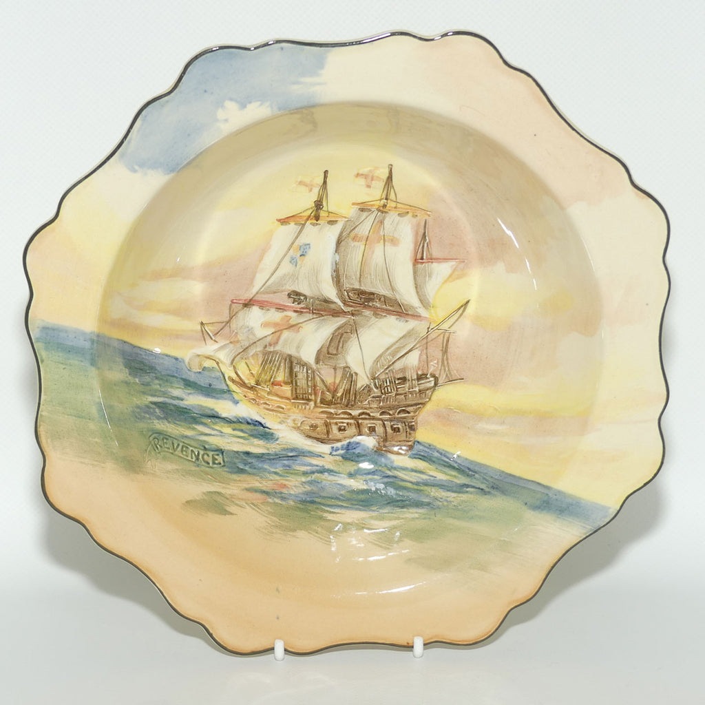 Many famous sailing ships are represented in this embossed, low relief series - which reflects the British fascination with the sea - and bears a special backstamp. In total 17 ships are depicted on various shapes. While Sir Francis Drake captained the Revenge, later under Sir Richard Grenville, who captained it to fight 53 Spanish ships before an honourable surrender. Sir Richard Grenville commanded the HMS Revenge when it was overwhelmed by a Spanish fleet in the Battle of Flores in 1591. Grenville, acting as Vice Admiral, decided to fight the much larger Spanish fleet to allow other English ships to escape, a stand immortalized in Lord Alfred Tennyson's "The Revenge: A Ballad of the Fleet". After a fierce battle, the Revenge was captured, Grenville died from his wounds, and the ship sank in a storm shortly after.