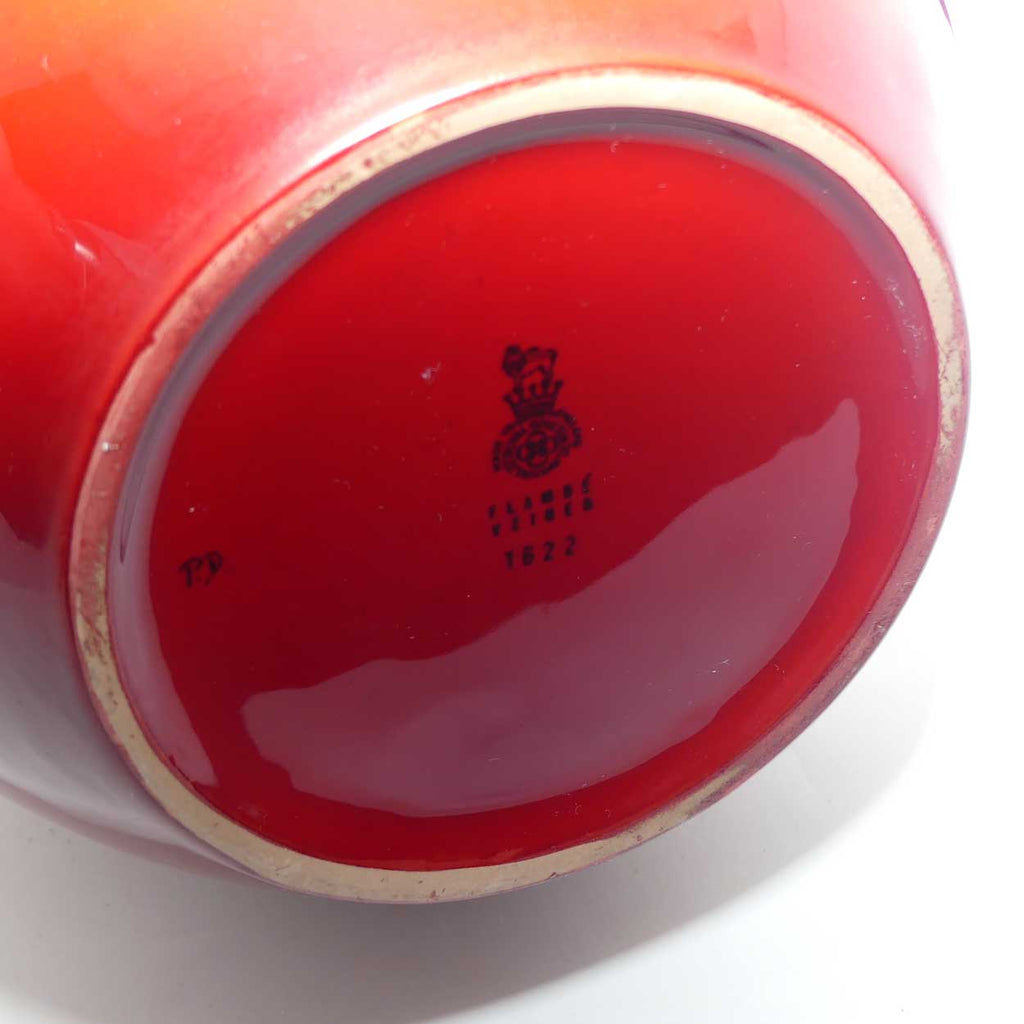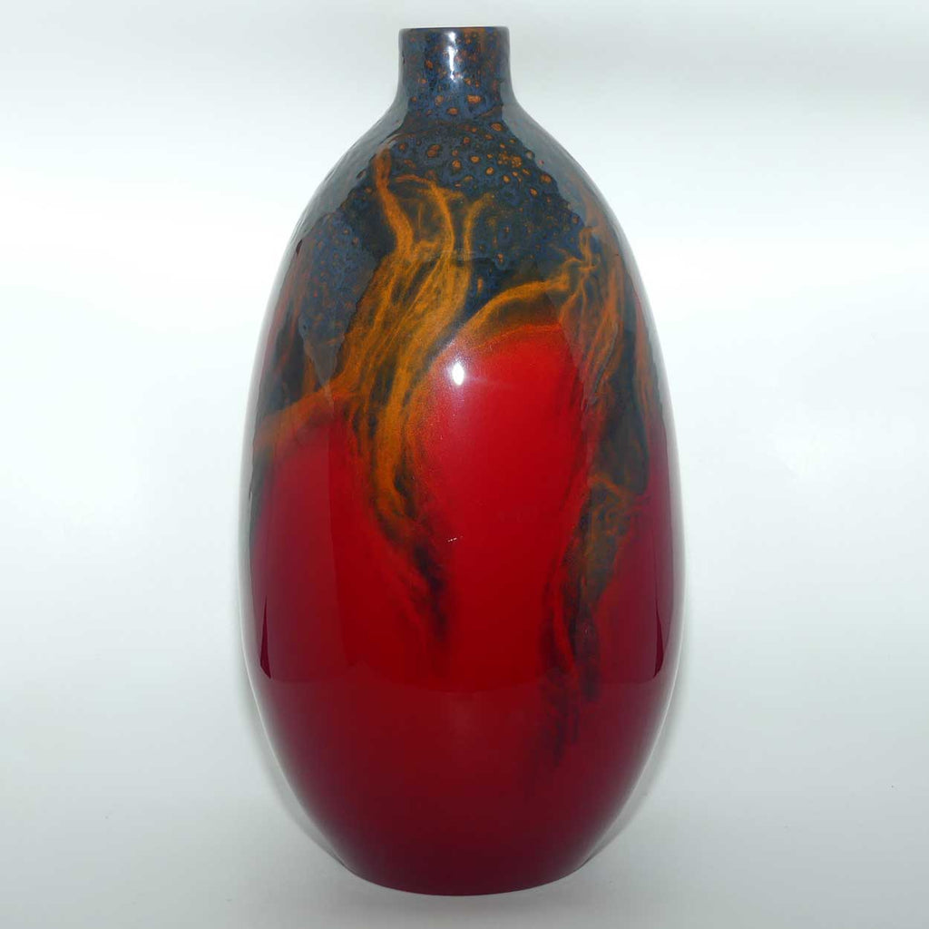 A truly magnificent example of Royal Doulton Flambe in a Prestige sized "statement" piece . The depth and variation of the highly collectable Veined Flambe glaze seen here encompasses Rich Reds, lots of Yellow Orange and hints of stunning Peacock Feather blues