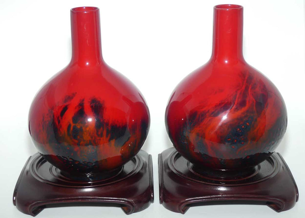 Royal Doulton Flambe Veined pair of tall neck bulbous vases (come with timber plinth bases for display)