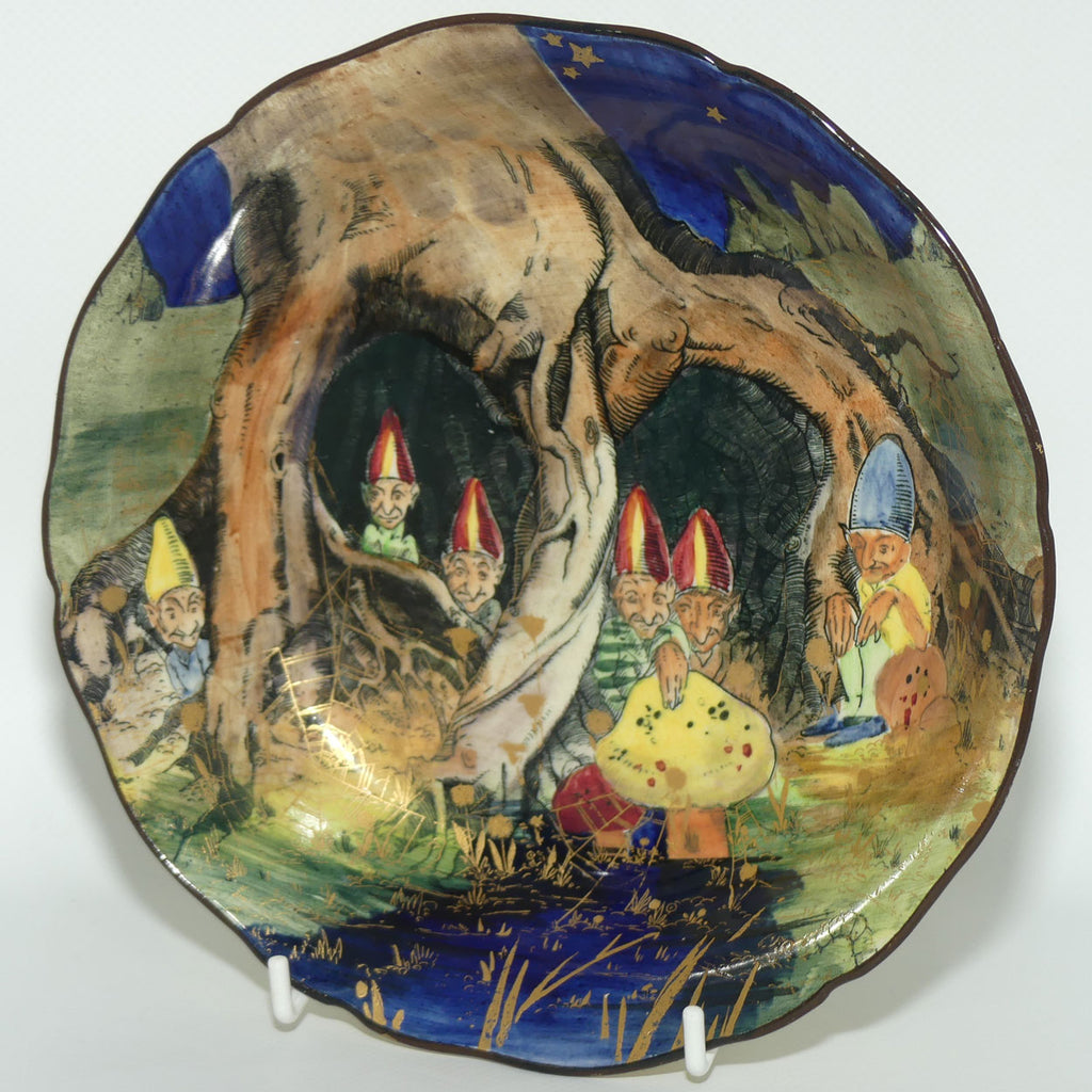 Arguably one of the most iconic of all of the Royal Doulton series patterns - Gnomes is seen with and without the gilt highlights - however with the on glaze gilt highlights (as seen here) is far more visually pleasing and more desirable - however neither are "common". This series pattern was designed by Charles Noke and inspired by Arthur Rackham's illustrations for Peter Pan in Kensington Gardens in 1906 - it was produced between 1927 and 1950 [however little production was allocated to novelty wares during WWII [1938 - 1945]. Gnomes is known as Munchkins in the USA.
