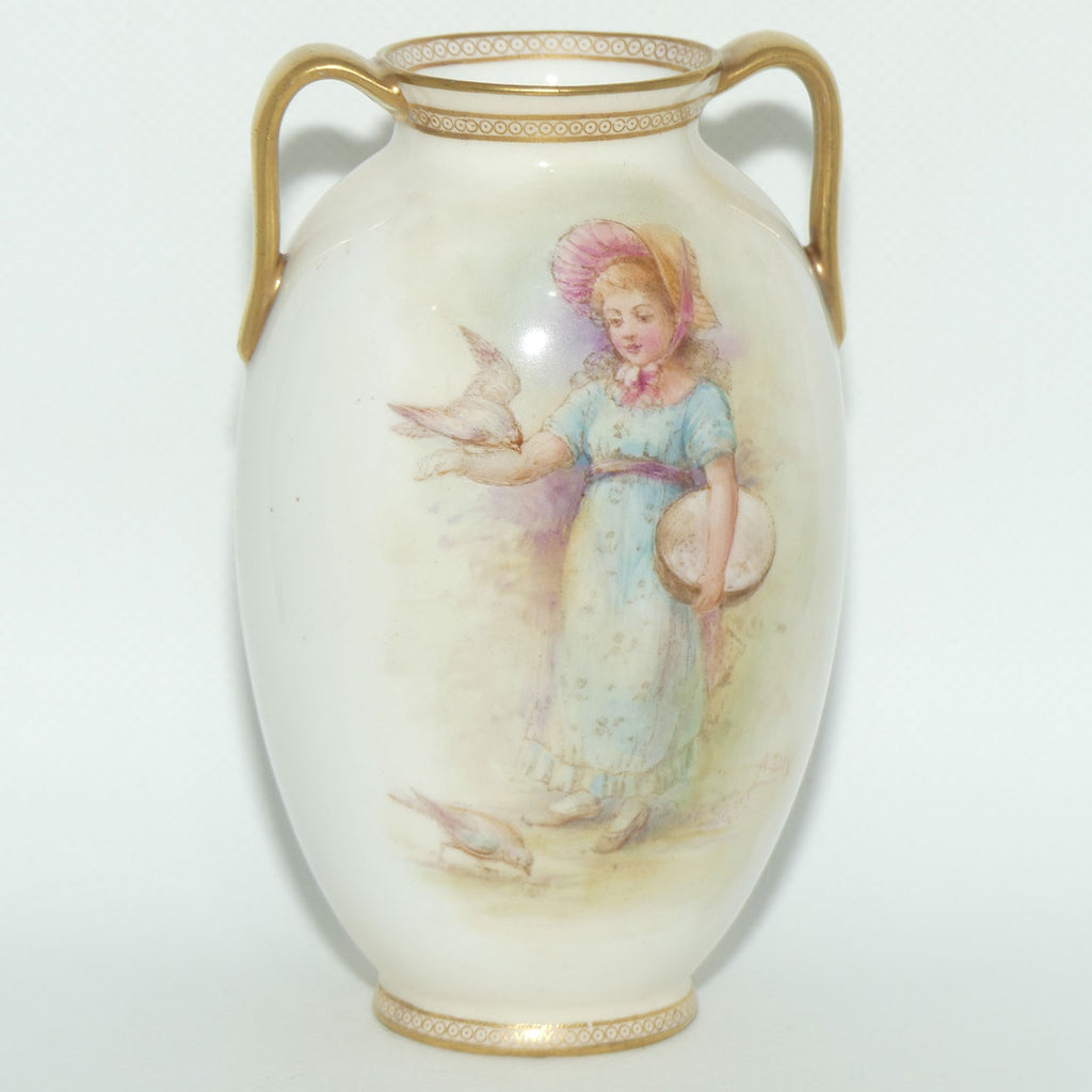 The front of the vase depicts a Victorian Girl with Bird in hand and one at her feet - the rear is a small cartouche with a pair of love birds perched on cupids bow and arrow