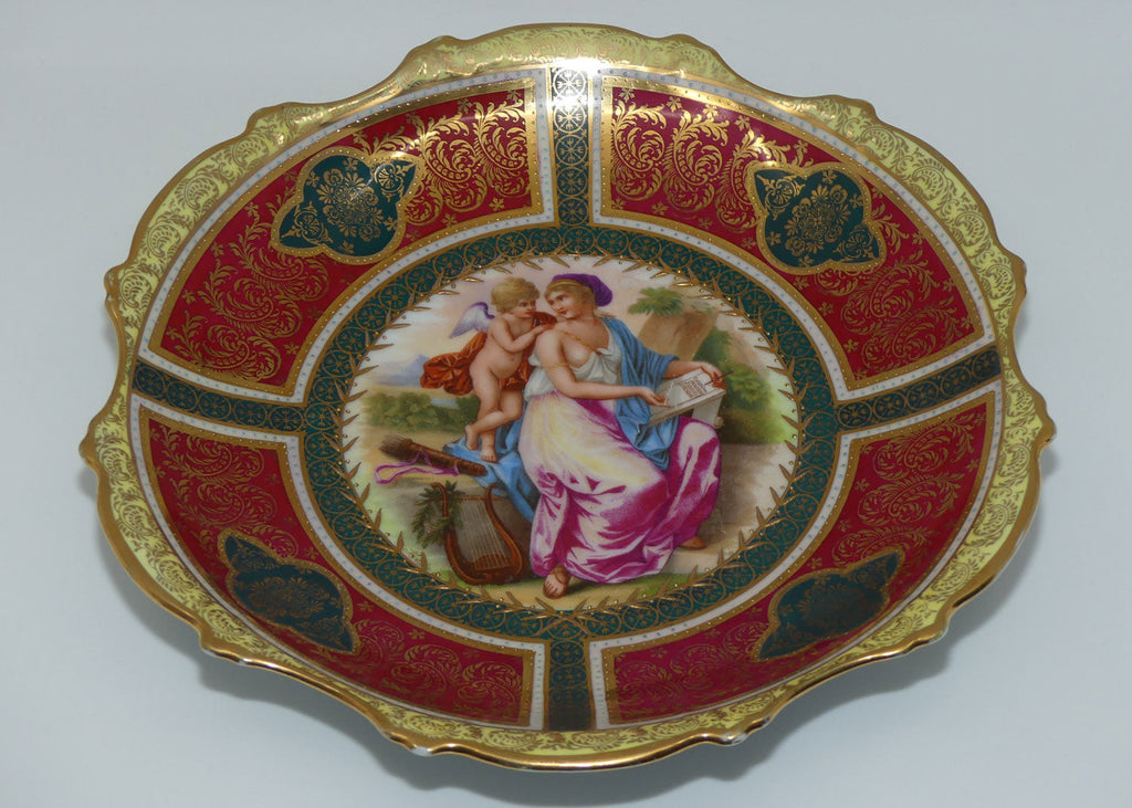 Depicts a Maiden and Putti and the design is complemented by fine gilt and turquoise enamel jewelling