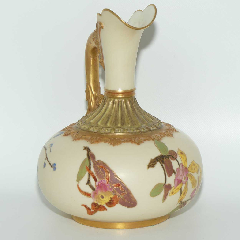 Royal Worcester Blush Ivory hand painted bulbous jug with orchid and dolphin handle (Smaller size)