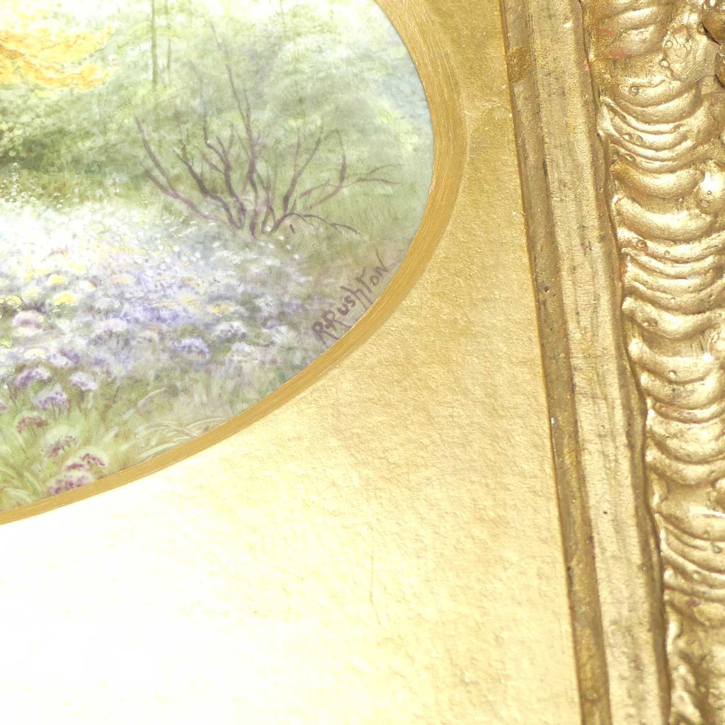 Born in 1886, Raymond Rushton spent most of his working life as a landscape painter at the Worcester Royal Porcelain Works. He specialised in country mansions, cottages and garden scenes and was a very meticulous artist with great attention to detail [seen in this piece]. He was well known for his series of Royal palace gardens in full rich colours and for his castle scenes in black and white.