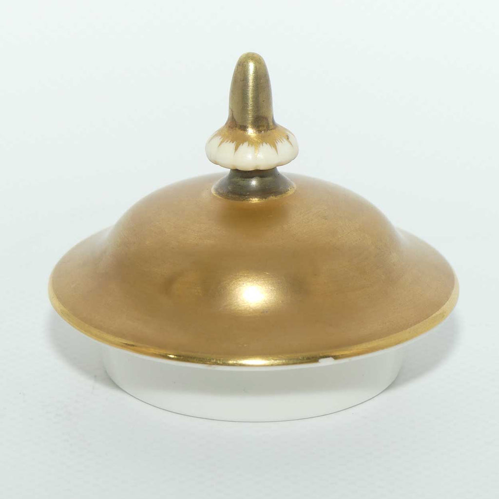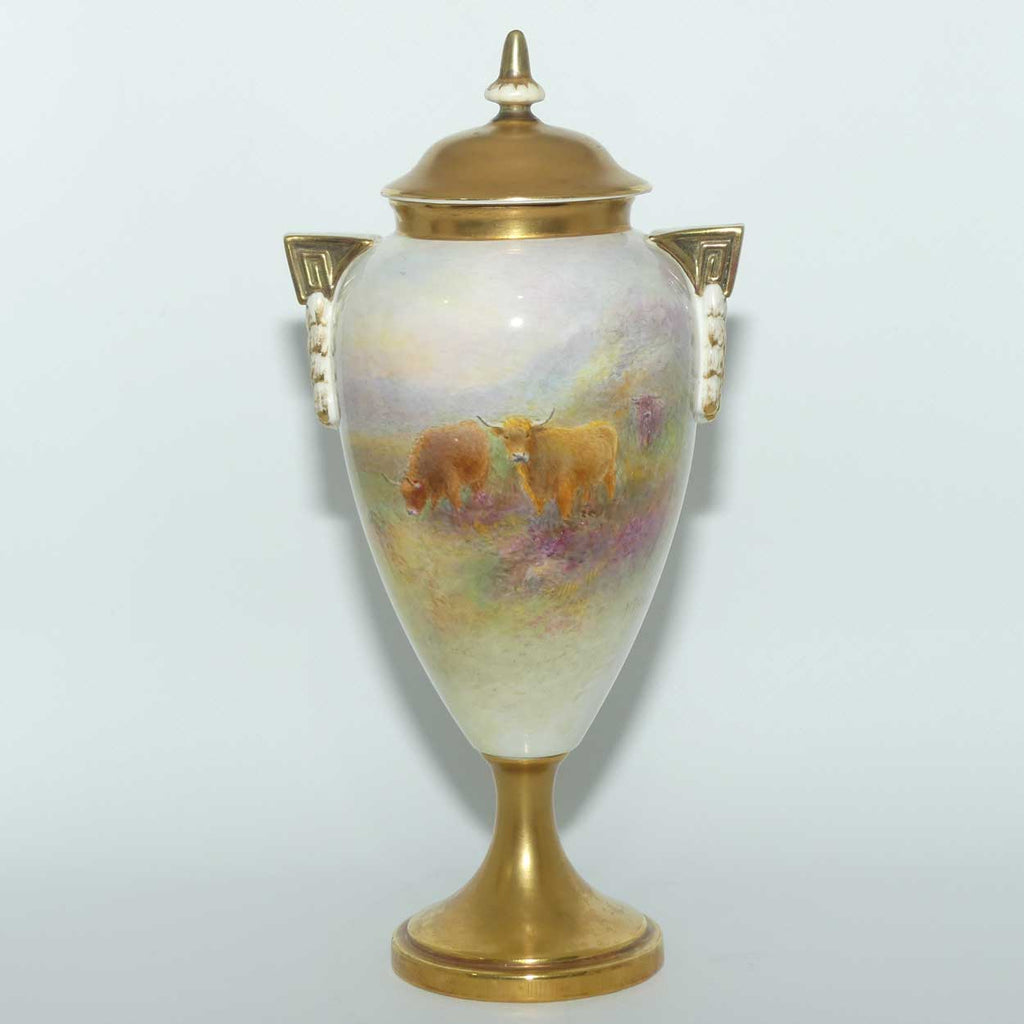 Royal Worcester hand painted Highland Cattle lidded vase with gilt decor and 2 triangular shape handles