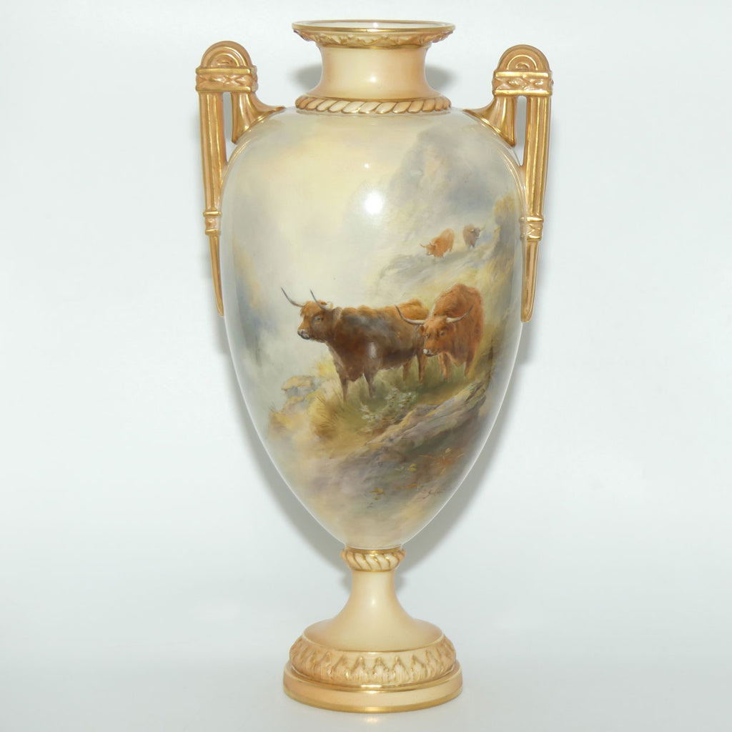 Royal Worcester hand painted twin handle Highland Cattle vase