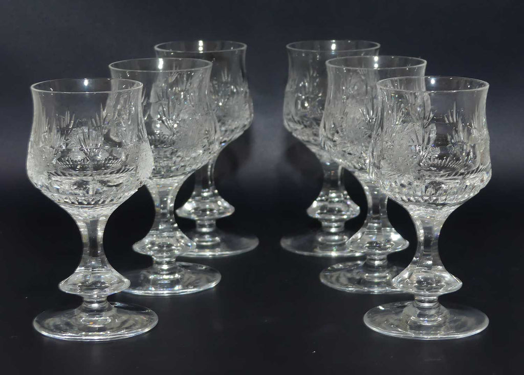 This set of 6 glasses have wheel cut pinwheel stars seperated by fine quality facets. Beautiful quality with a richness in style. They hold approx 50ml