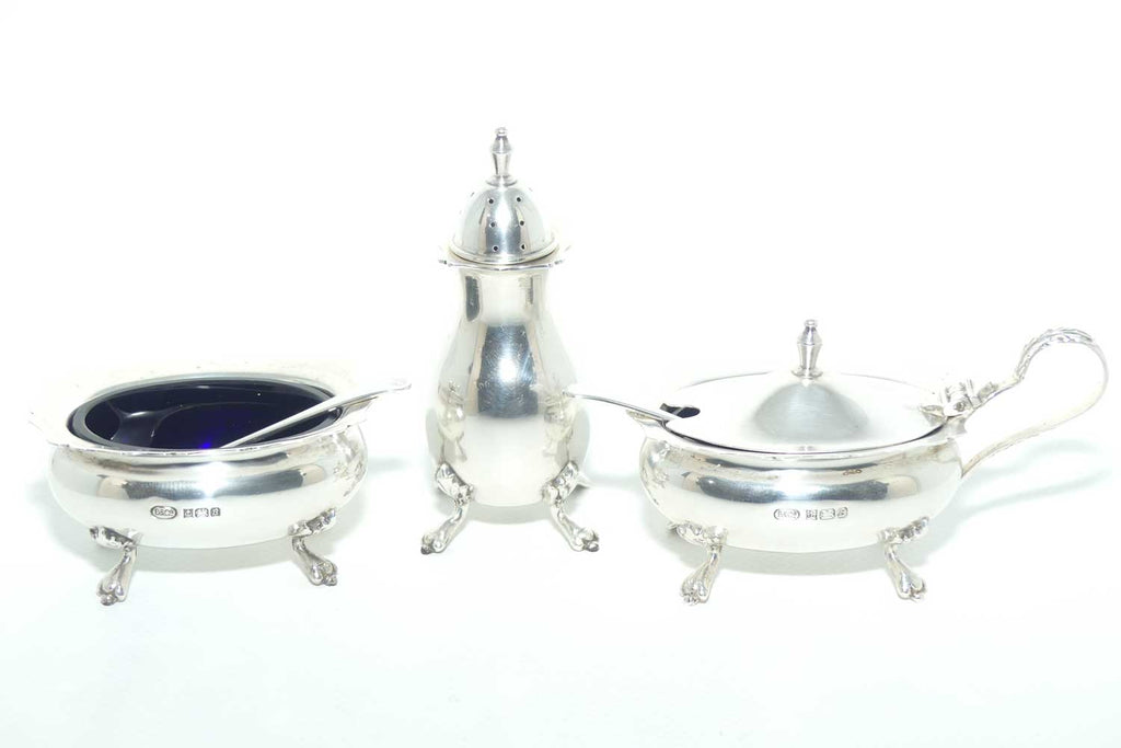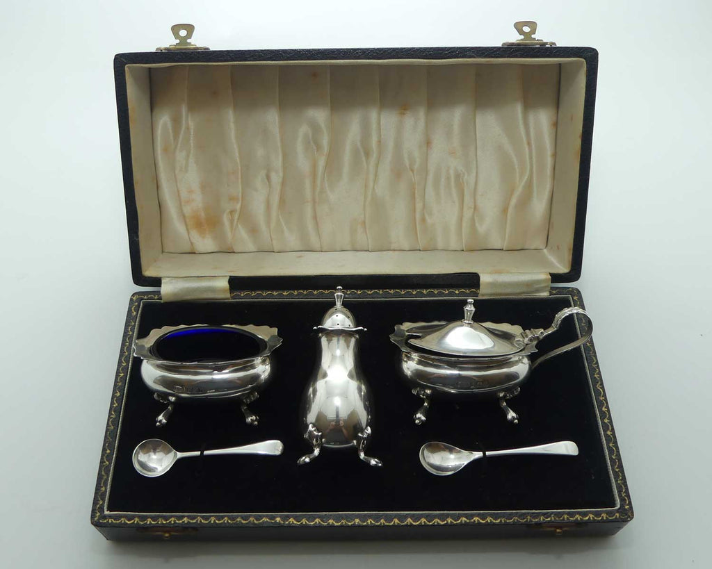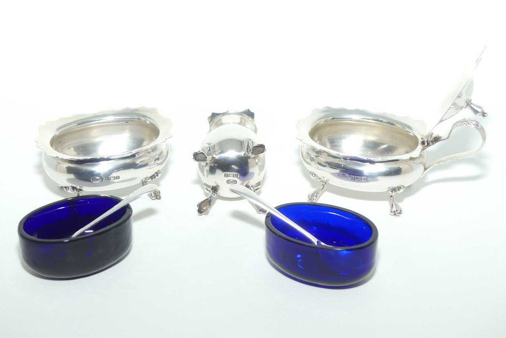 Comprises open salt with blue glass liner and salt spoon, pepper pot and lid, mustard pot with blue glass liner and mustard spoon and is in the original box
