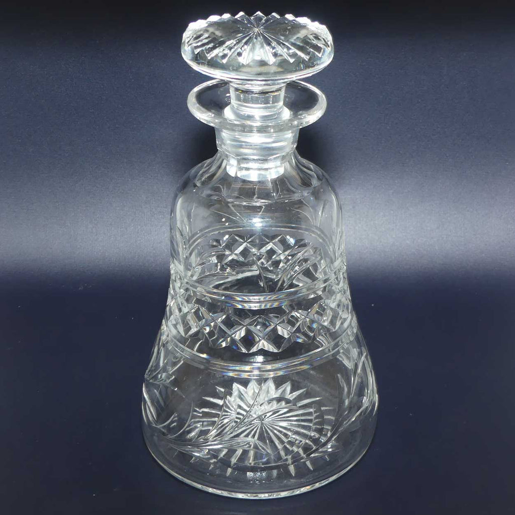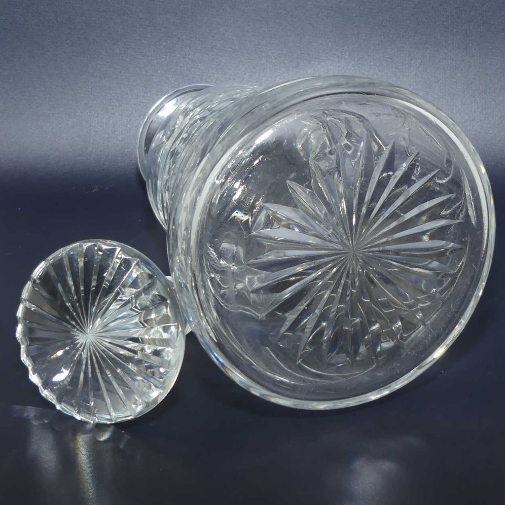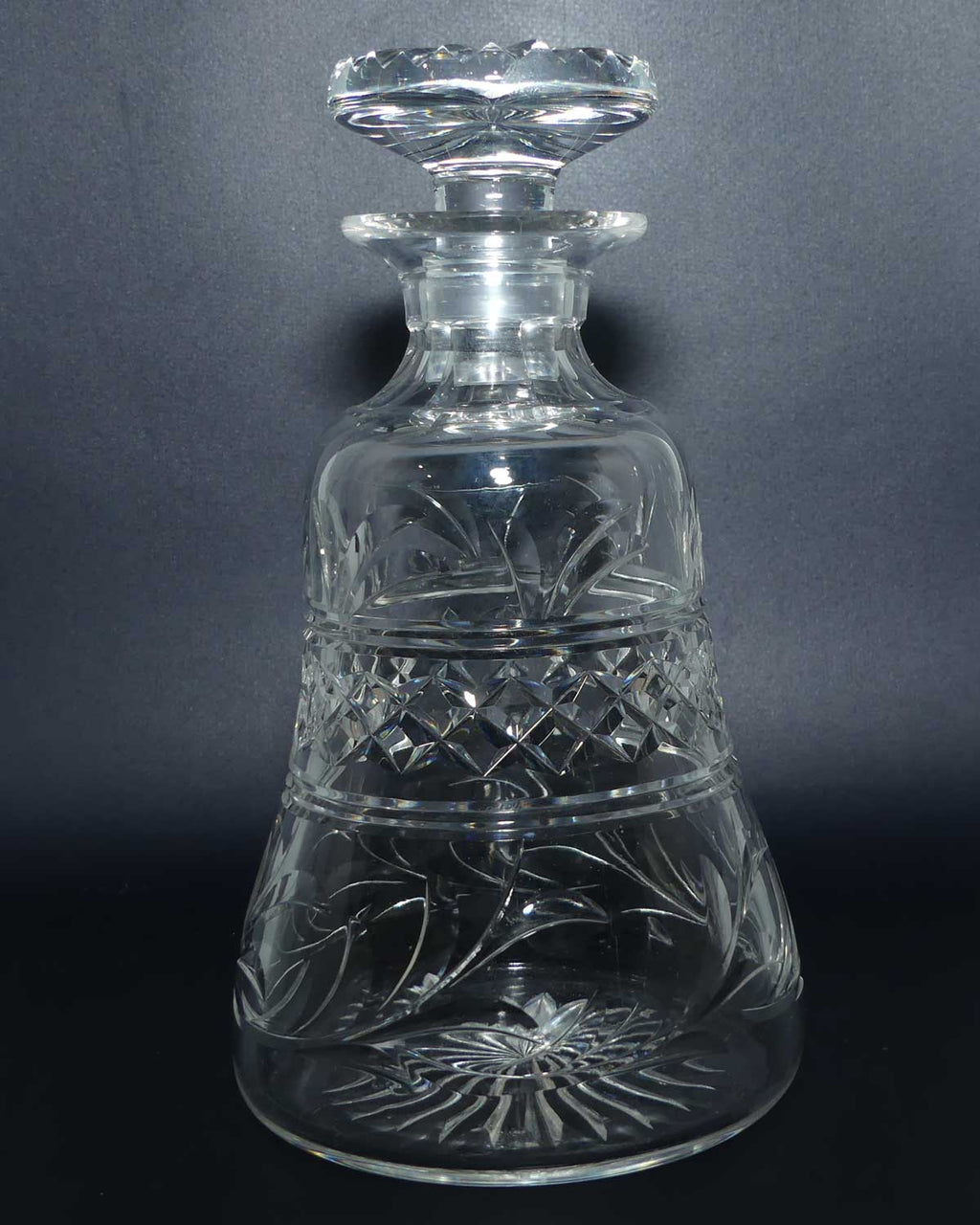 Waisted shape decanter decorated with a horizontal diamond cut band and a facetted scrolling vine pattern above and below the central band. The mushroom stopperr is a classically facetted 24 point star design - the base has an original acid etched Stuart mark to (that will always be there!)