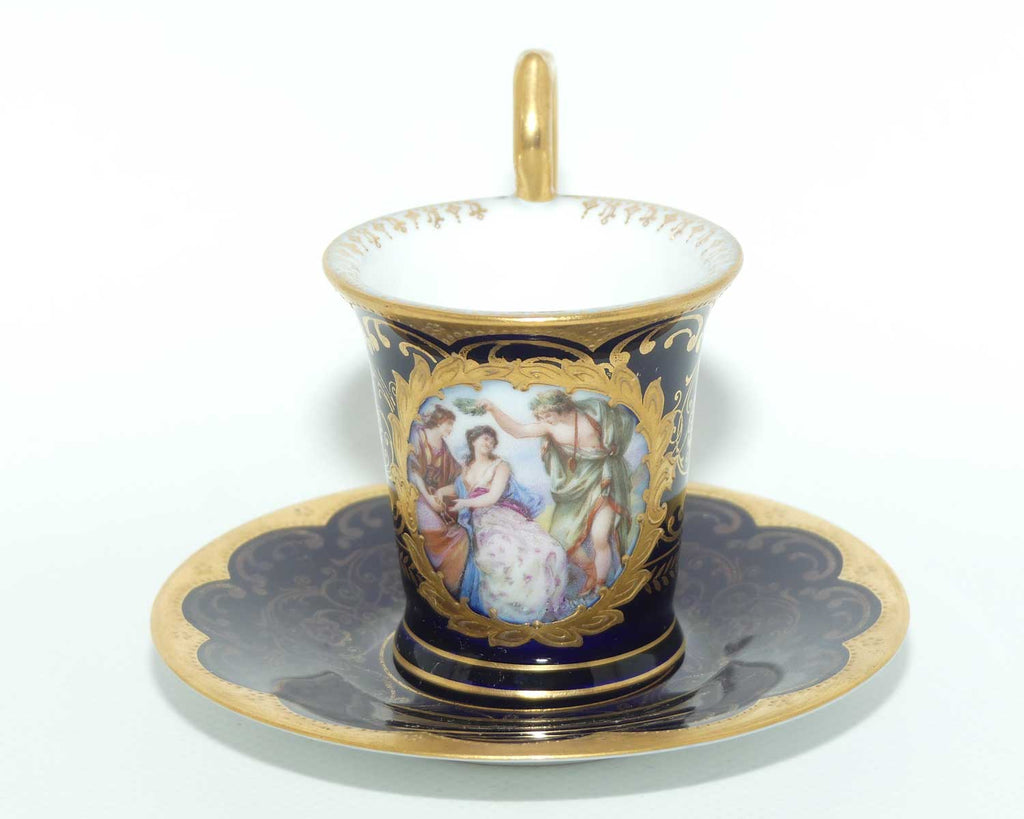 The cameo panel on the cup depicts a Grecian scene - the cup is accentuated with an elaborate high handle