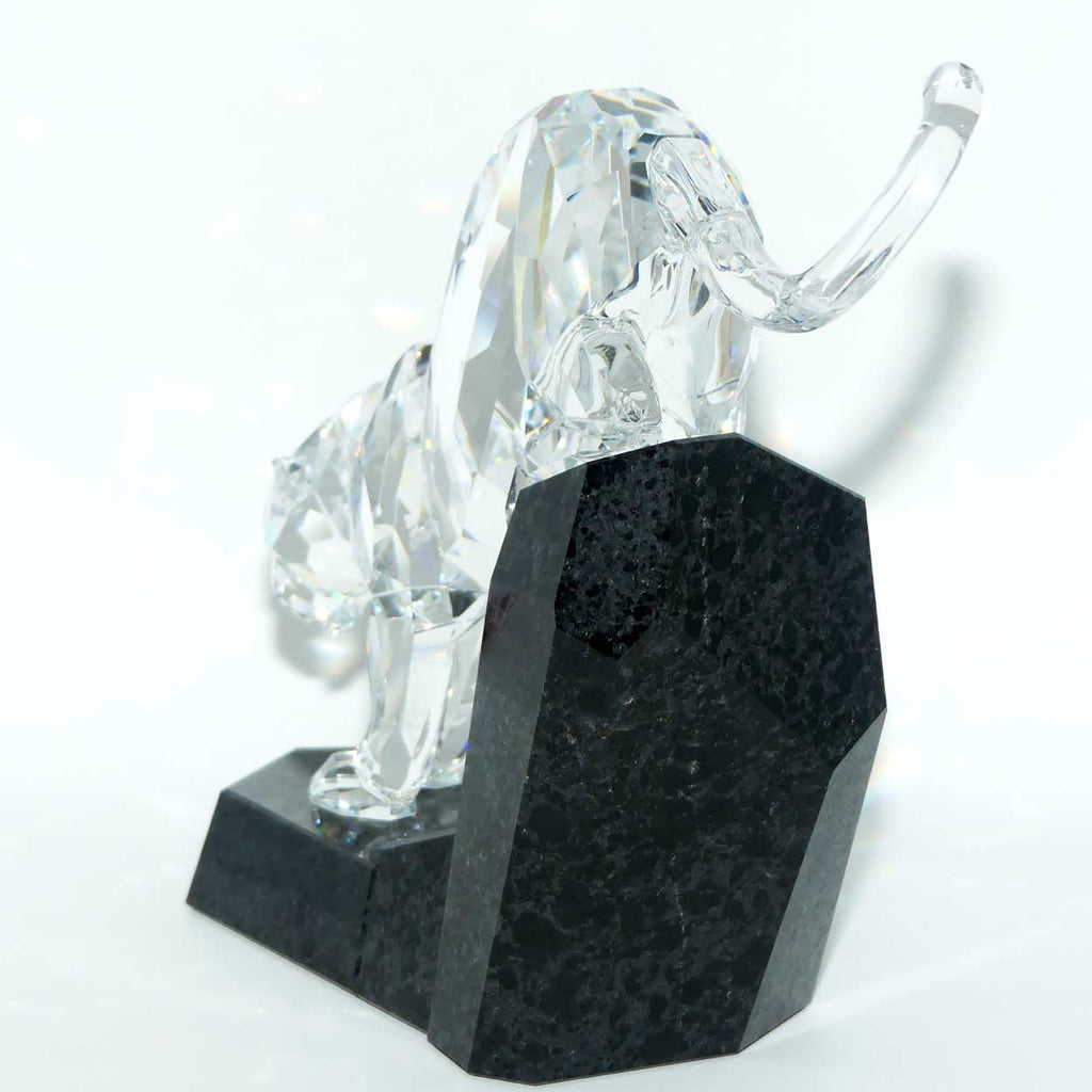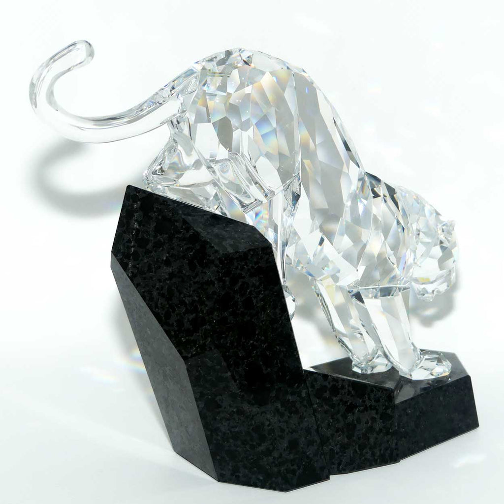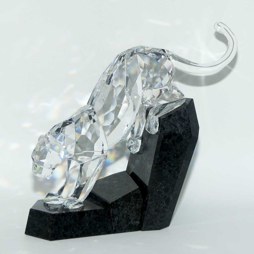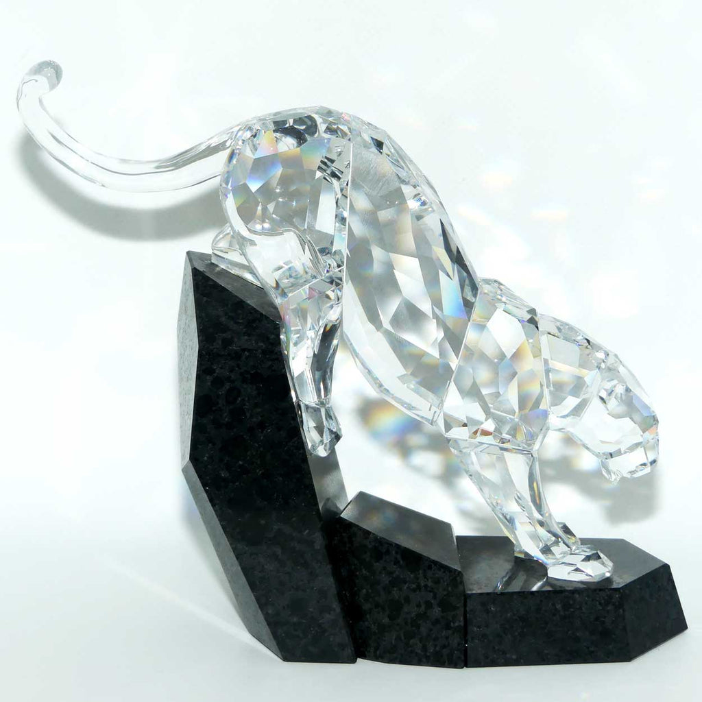 This retired Swarovski Crystal Panther in clear crystal was part of the Soulmates theme. Elegance and power emanate from this fully faceted clear crystal panther with unfaceted clear crystal tail. The panther is poised to leap from its cut black spot granite base. A perfect sideboard piece with protective black felt layer on bottom of base.
