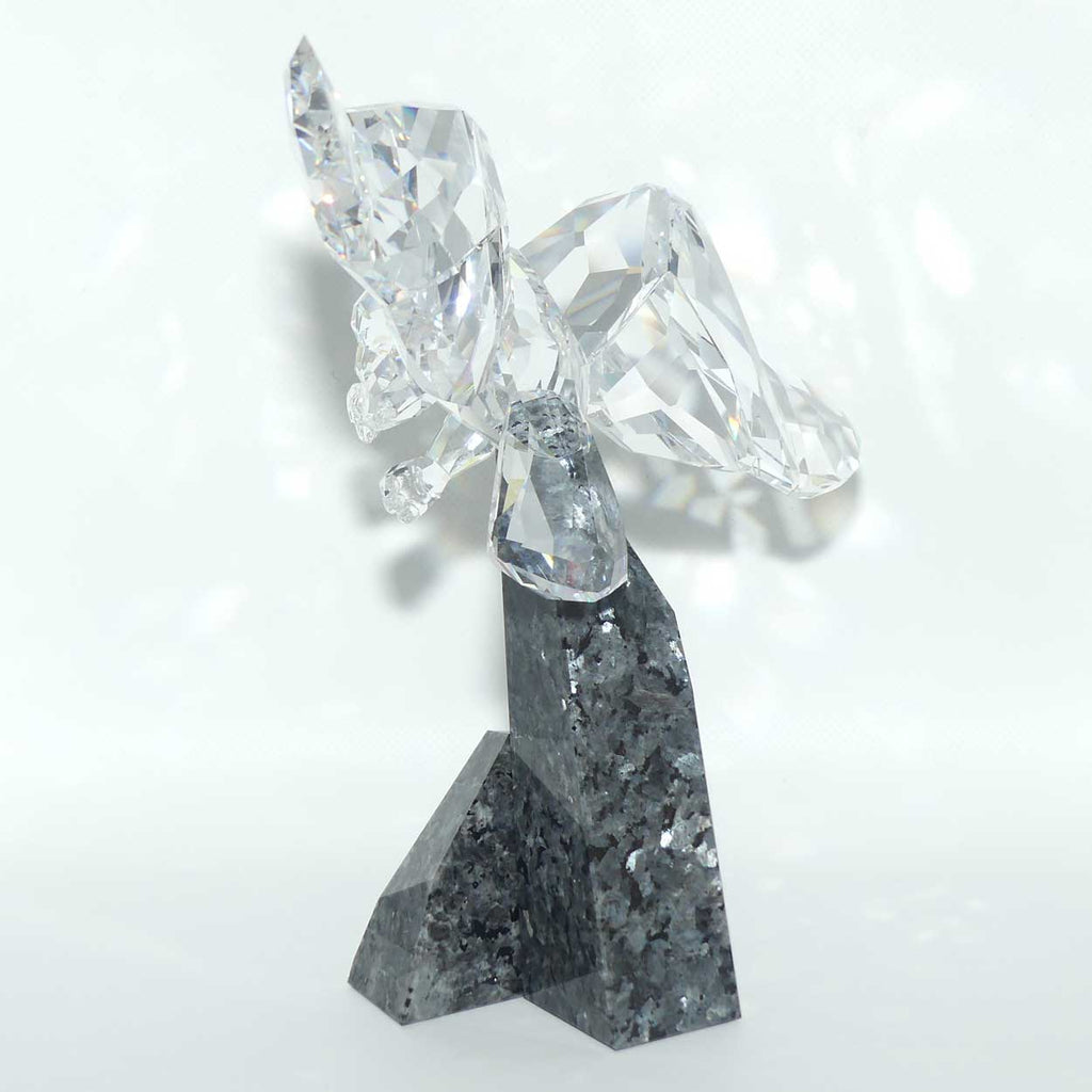 This retired Swarovski Crystal Eagle in clear crystal was part of the Soulmates theme. Freedom is represented by this fully faceted clear crystal eagle with open wing-span as if soaring through the air. Majestically perched on a cut blue pearl granite base with protective black felt layer on bottom.