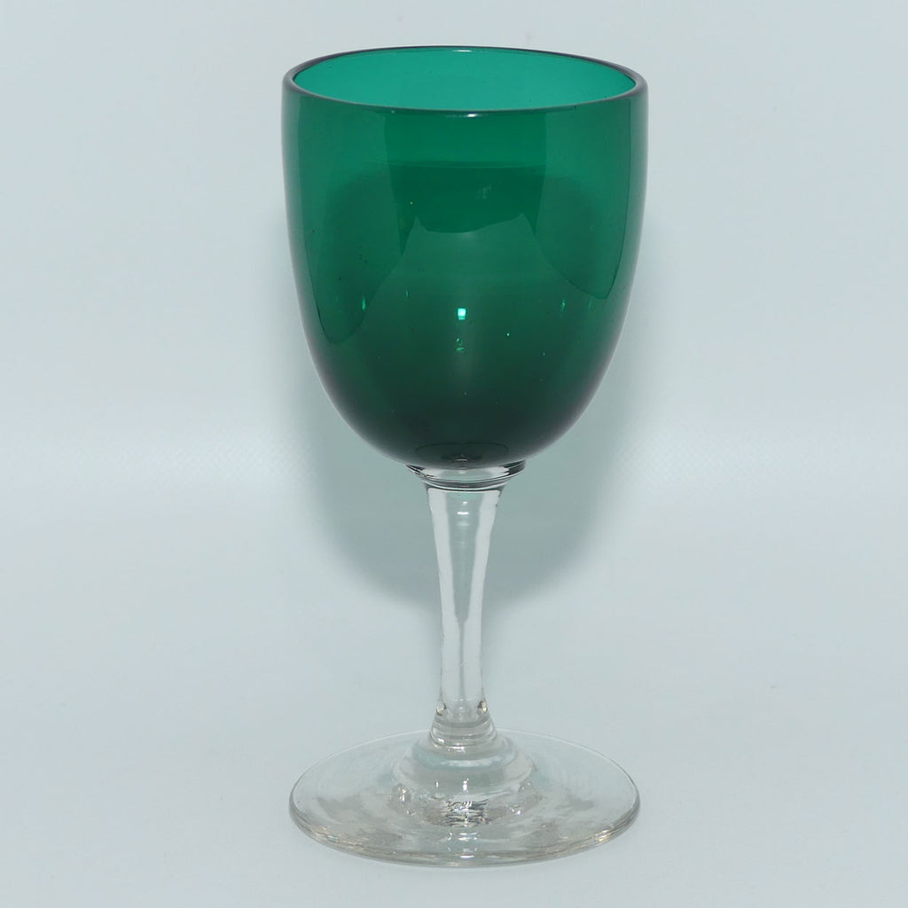 A traditional hand blown Bristol Green wine glass, with a clear glass stem and foot